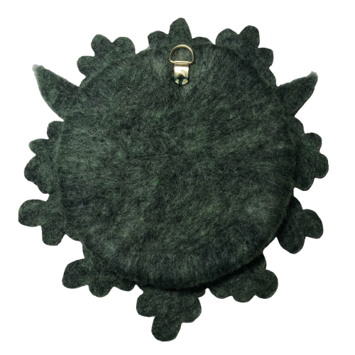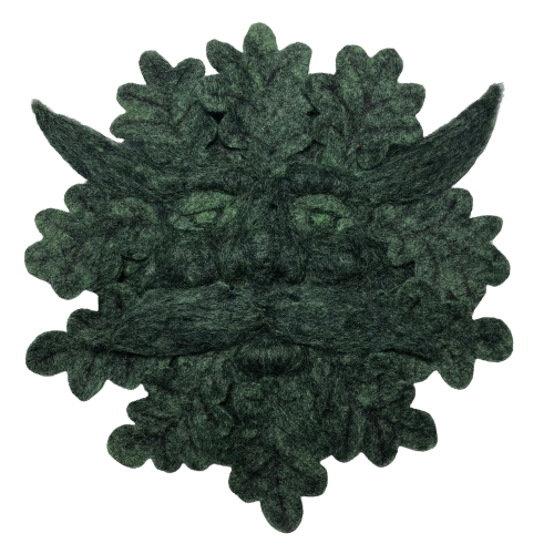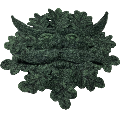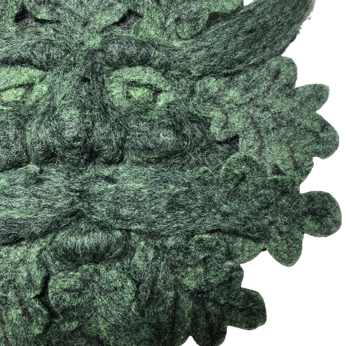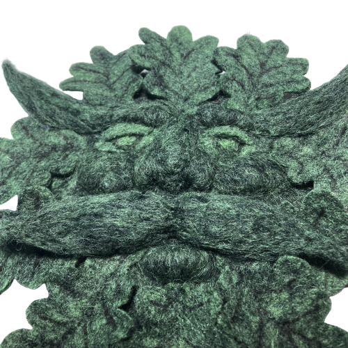 A green man has been made from green wool fibres using needle felting and wet felting techniques. The circular base has been needle felted using green wool fibres and the facial features sculpted and needle felted to one side of the base. The oak leaves around the circumference have been cut from a piece of hand made felt, wet felted using the same green fibres, and needle felted onto the base. A small gold coloured hanging loop has been attached to the reverse to ease mounting of the green man.
