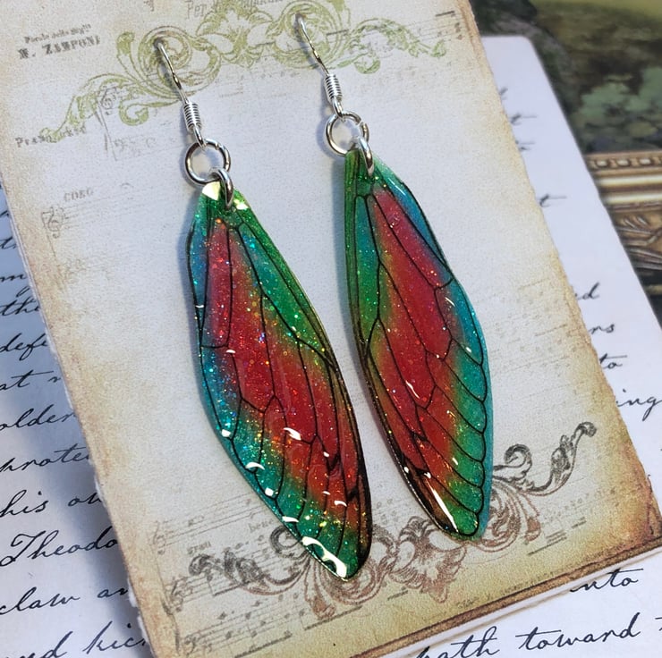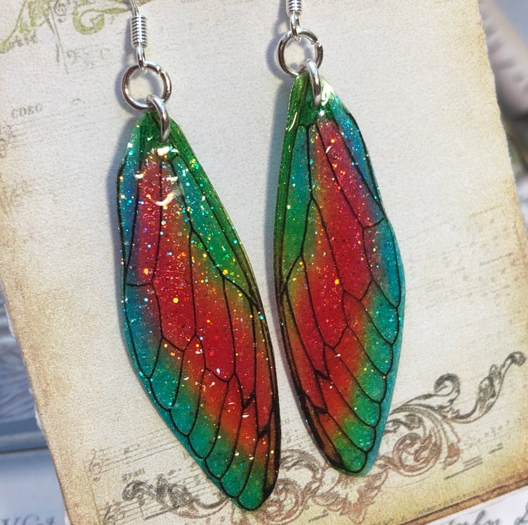 Beautiful fairy wing earrings in colourful shades of blue, green, orange and yellow.