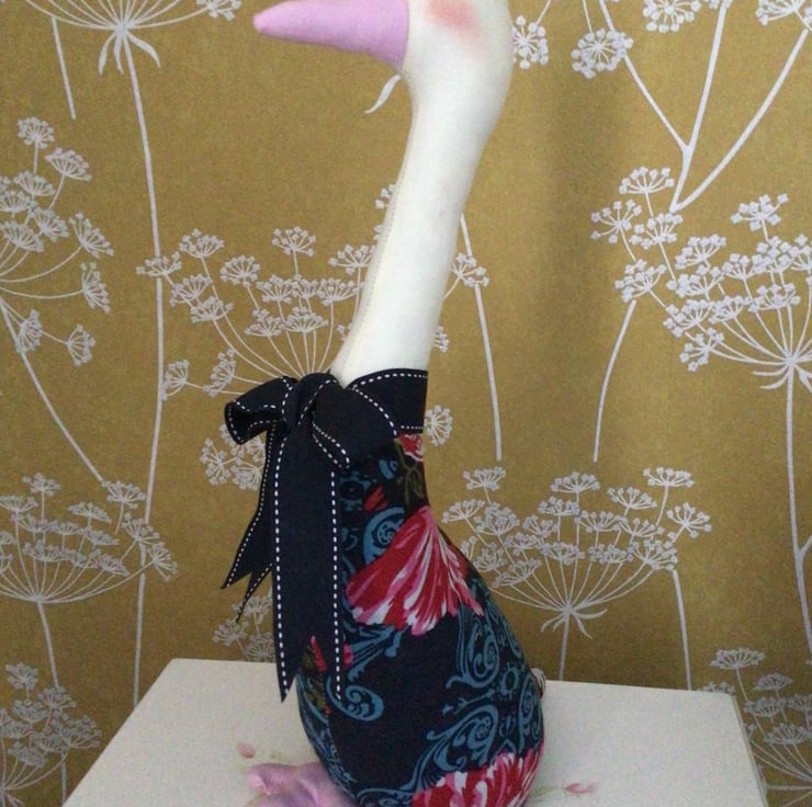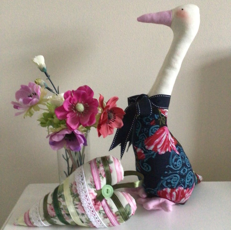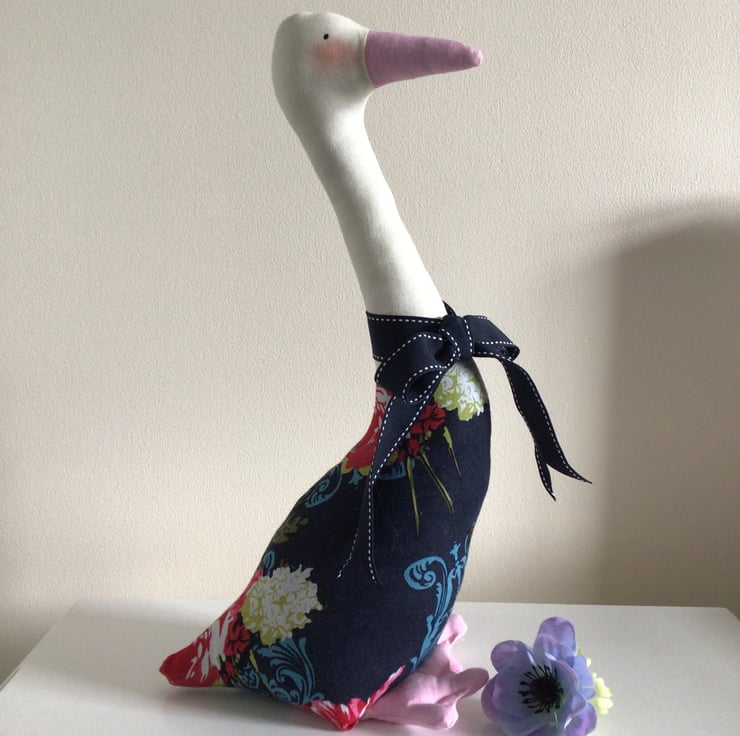 This is a lovely large Duck shelf sitter Ornament, in a dark blue floral fabric.
