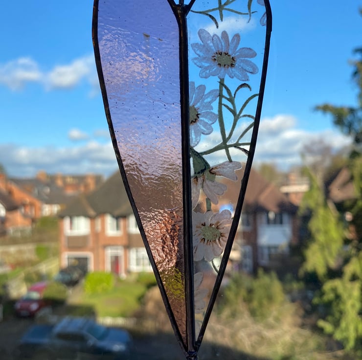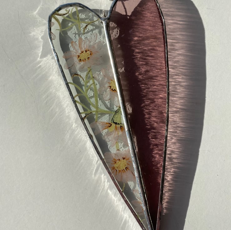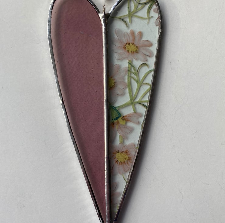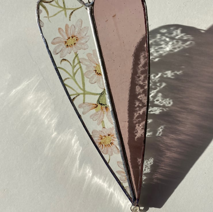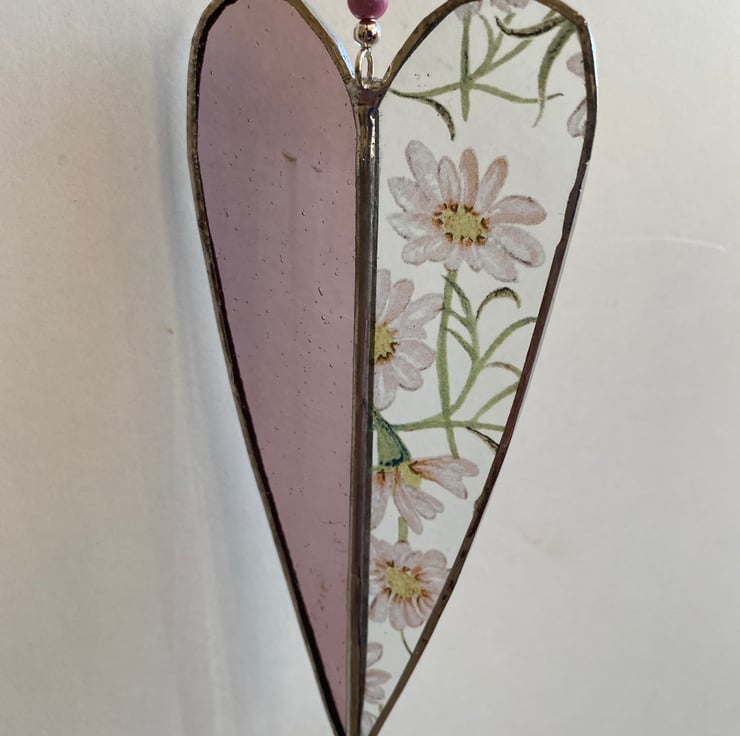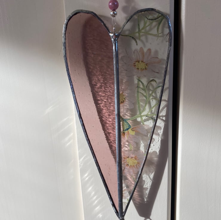 An elegant two-tone heart made using the Tiffany (copper foiled) method of stained glass. This long heart is comprised of 2 pieces of glass, one side is a pale pinky colour, and the other is lovely pink and green floral glass. There is a small silver coloured heart hanging on the end of the decoration, and two small silver beads and a larger pink bead sit on the clear nylon hanging thread.