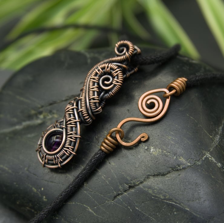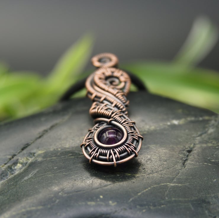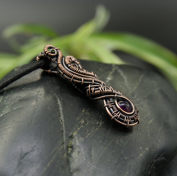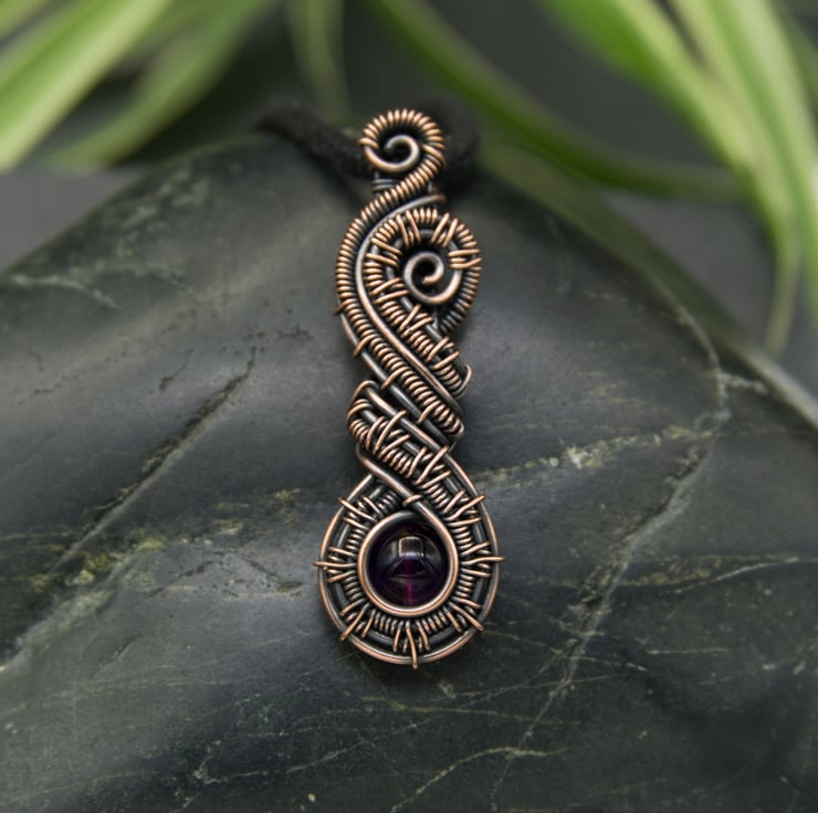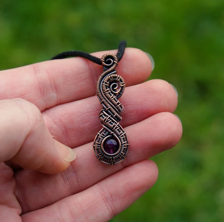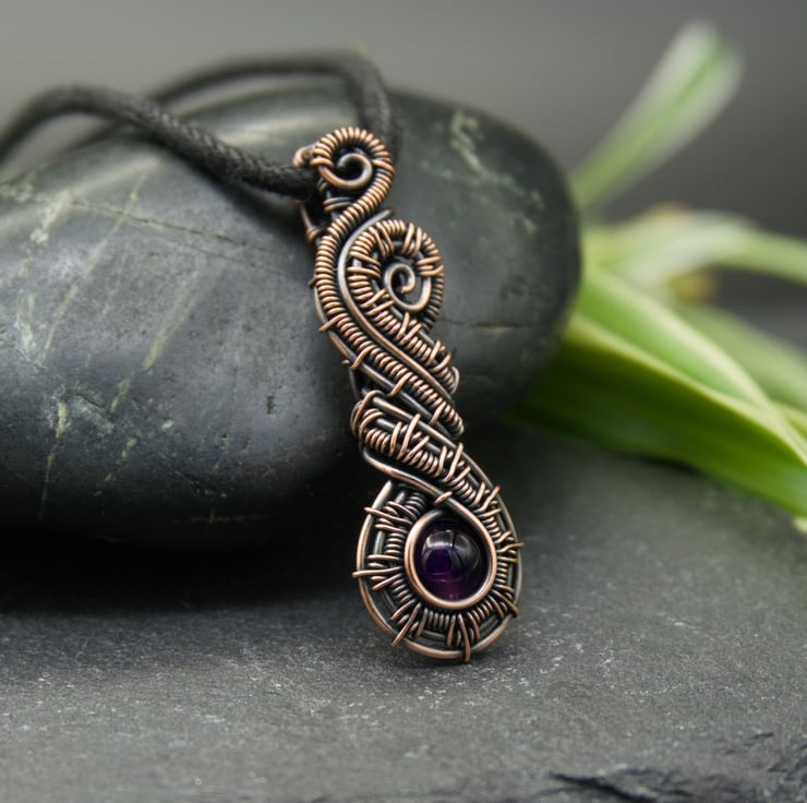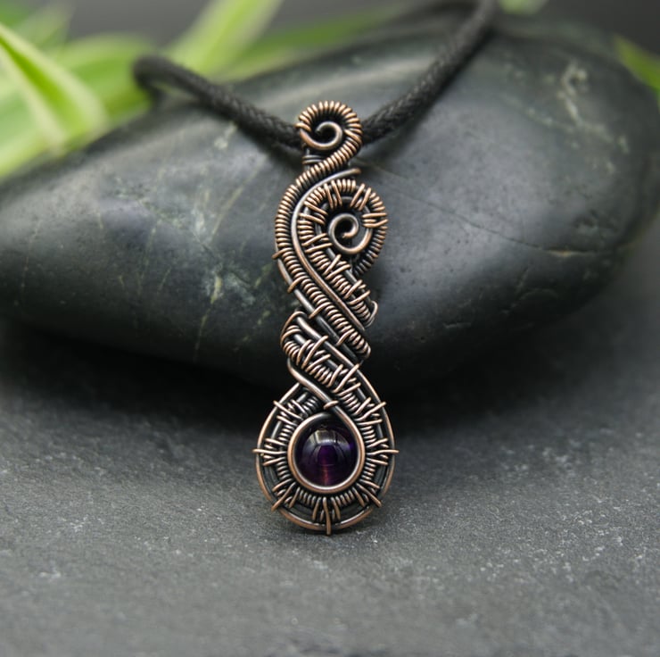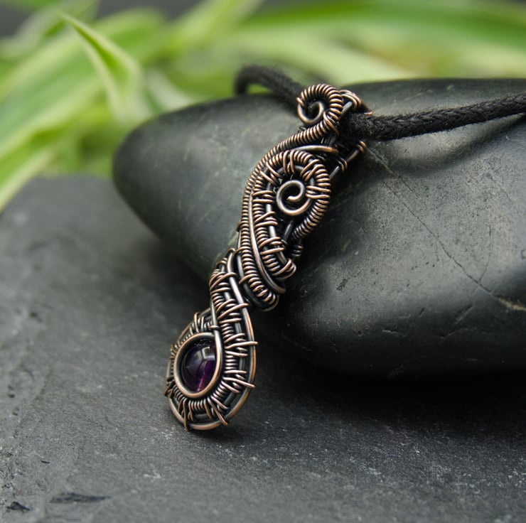 This beautiful pendant has been woven from copper wire and features a dark purple Amethyst bead. The intricately woven wires frame a single 6mm round Amethyst bead which sits at the bottom of the pendant. These woven sections then swirl around above the bead, finishing with little spirals at the top. A simple woven bail completes this stunning and unusual design.