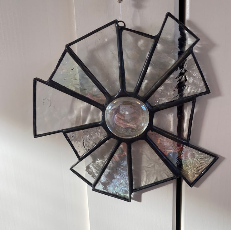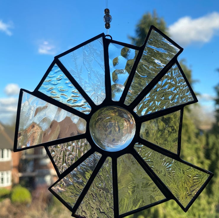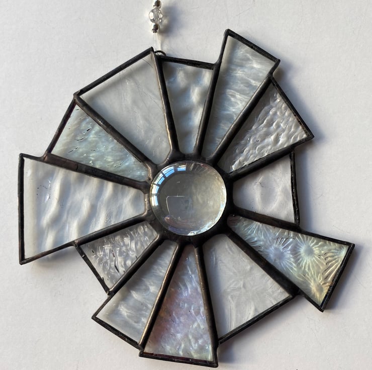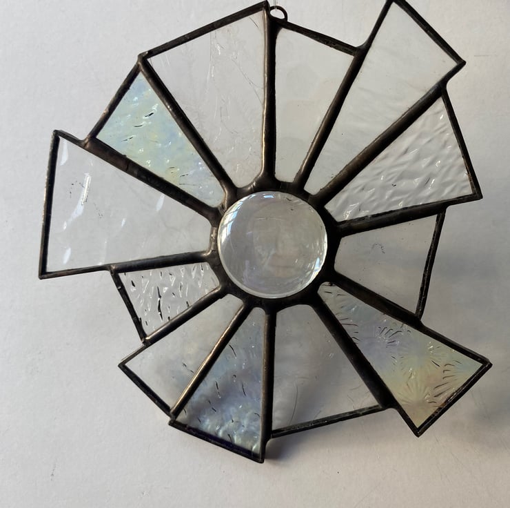 A beautiful 12 point abstract stained glass decoration made using the Tiffany ( copper foiled ) method of stained glass . Each piece of glass is a clear texture and some are clear iridescent. The centre is a beautiful clear glass nugget .It has 2 small silver coloured and a clear bead on the hanging nylon thread .