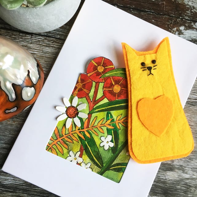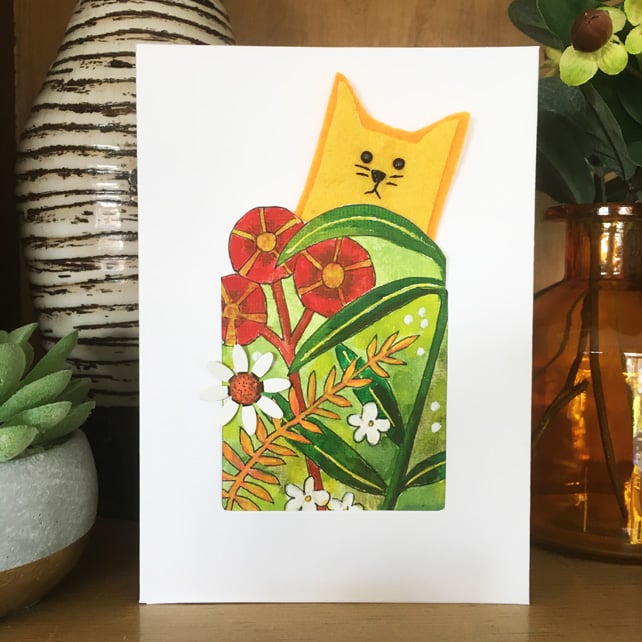 A quirky card for a cat lover. This cute card features a felt cat hiding in the garden.