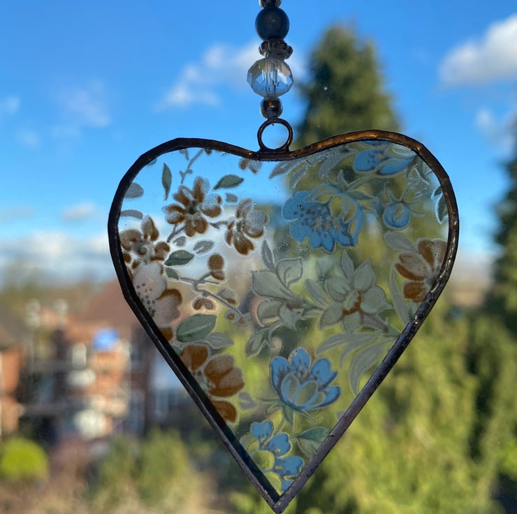 A beautiful stained glass heart made using the Tiffany (copper foiled) method of stained glass. It has been made using a lovely blue, peach and yellow flowery glass.