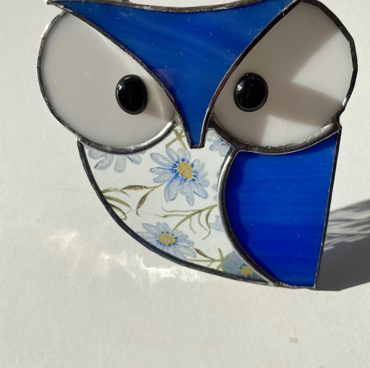 A beautiful stained glass owl made using the Tiffany ( copper foiled ) method of stained glass . It is made in a lovely blue opaque ,white opaque and clear blue , yellow and green flowery glass with 2 black glass nugget eyes.