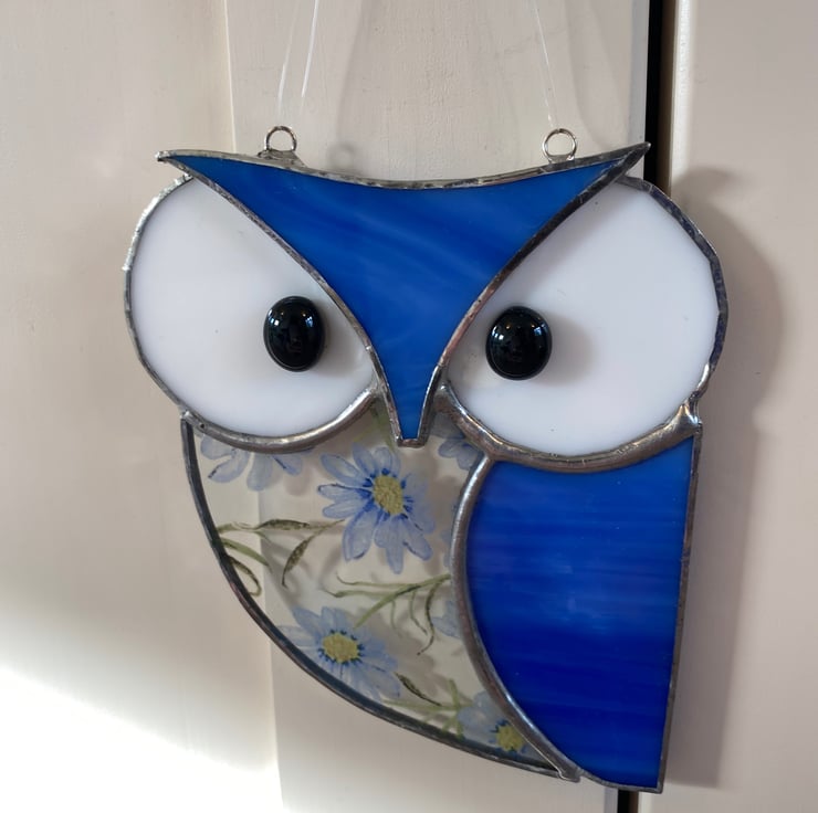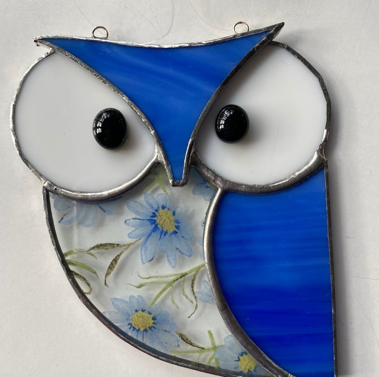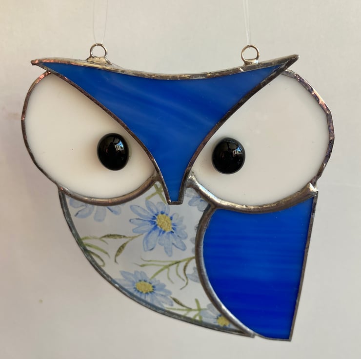 A beautiful stained glass owl made using the Tiffany ( copper foiled ) method of stained glass . It is made in a lovely blue opaque ,white opaque and clear blue , yellow and green flowery glass with 2 black glass nugget eyes.