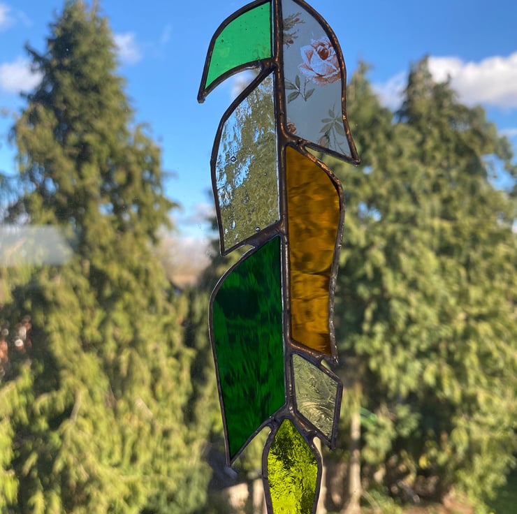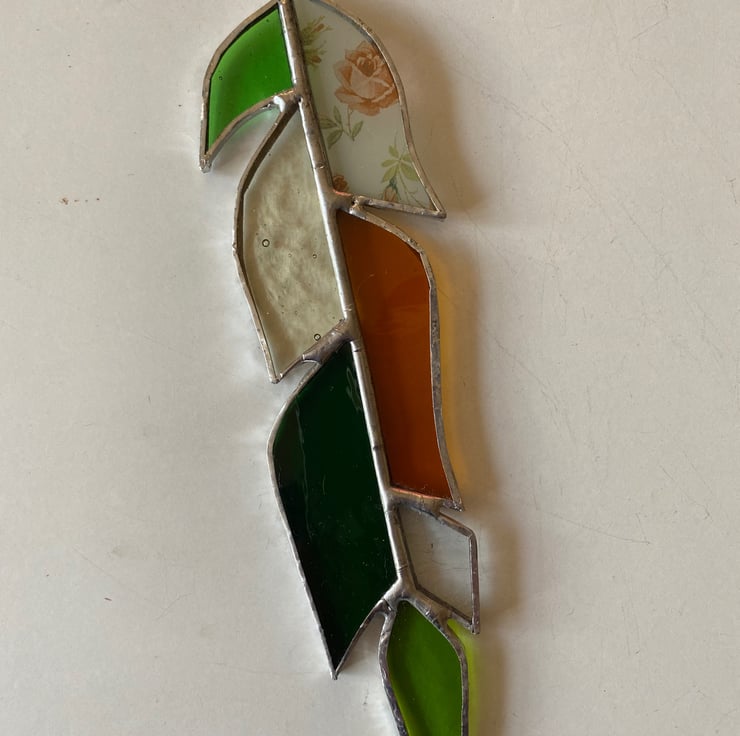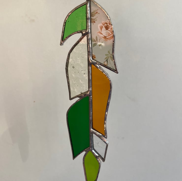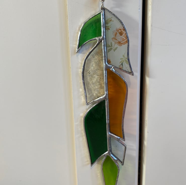 A beautiful pink and purple feather made using the Tiffany (copper foiled) method of stained glass. The feather is made up fo 7 individual pieces of glass in varying shades of green, amber and pale yellow, each piece of glass also varies in size and texture. The feather is topped with two small silver beads and one larger orange bead at the base of the clear nylon hanging thread.