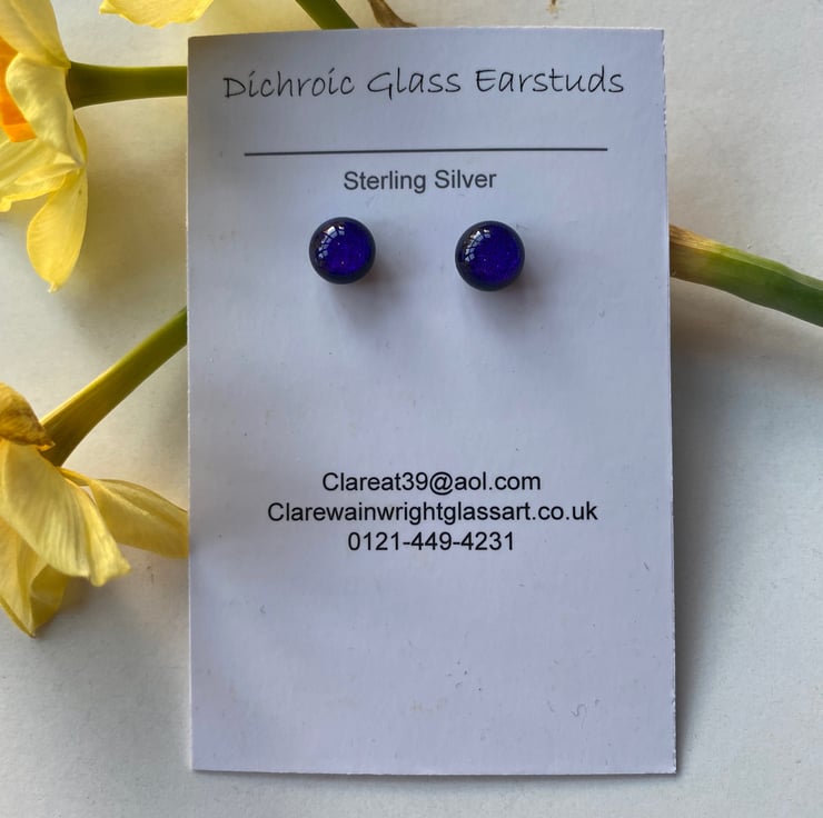A beautiful pair of fused glass earrings. They have been made using a gorgeous deep purpley blue dichroic glass which has a different transmitted and reflected colour giving a gorgeous effect when looked at from different angles .