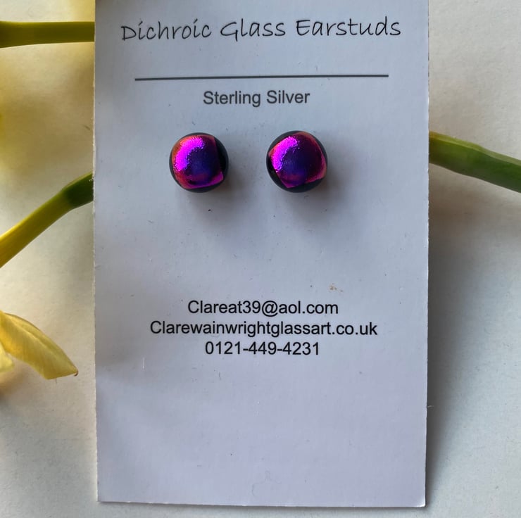 A beautiful pair of fused glass earrings. They have been made using a gorgeous pinky purple dichroic glass which has a different transmitted and reflected colour giving a gorgeous effect when looked at from different angles .