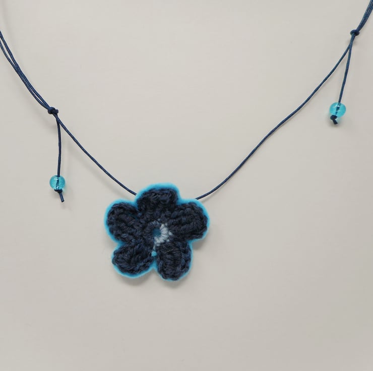 This is then handstitched onto an inky blue thin waxed cotton cord, with adjustable slip knots and trimmed with turquoise crackle glass beads at the end.