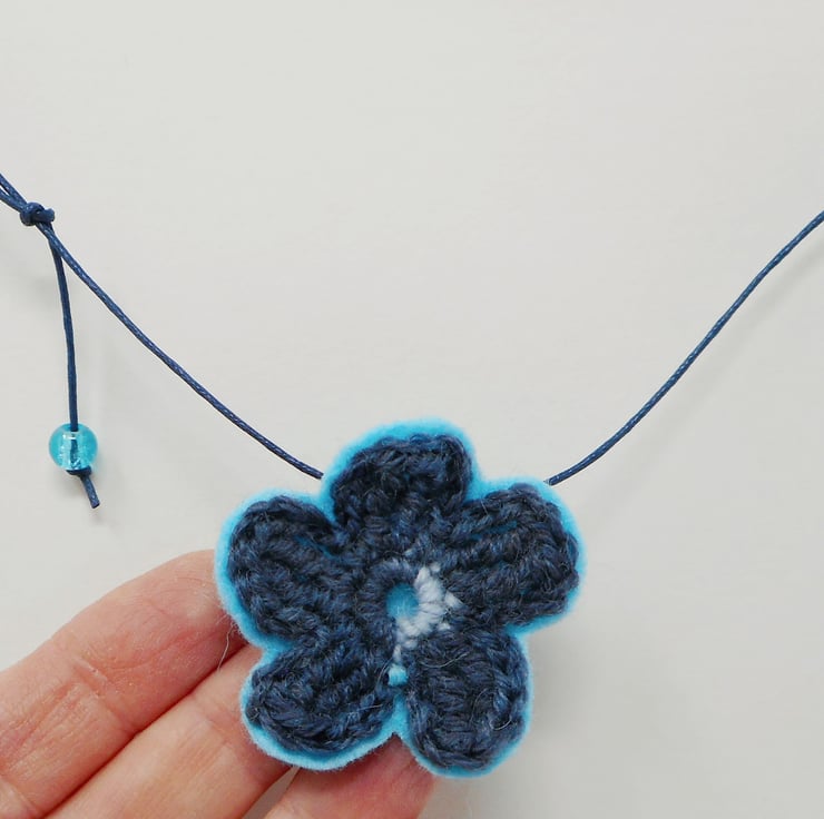 I've crocheted the flower in a denim blue yarn that was varigated, so the very centre has a little dove grey splash. The felt backing is a wool blend felt, in turquoise, and has been cut to extend past the flower so it peeks out. The thread colour I've used for this matches the front yarn as closely as possible, so stitches are visible on the back (see photo).