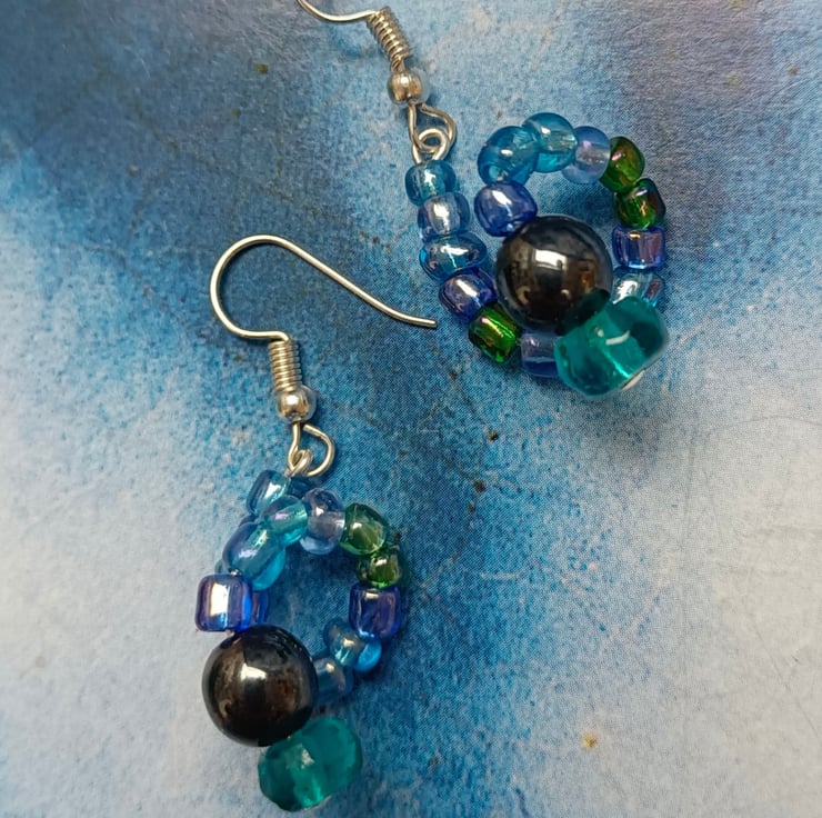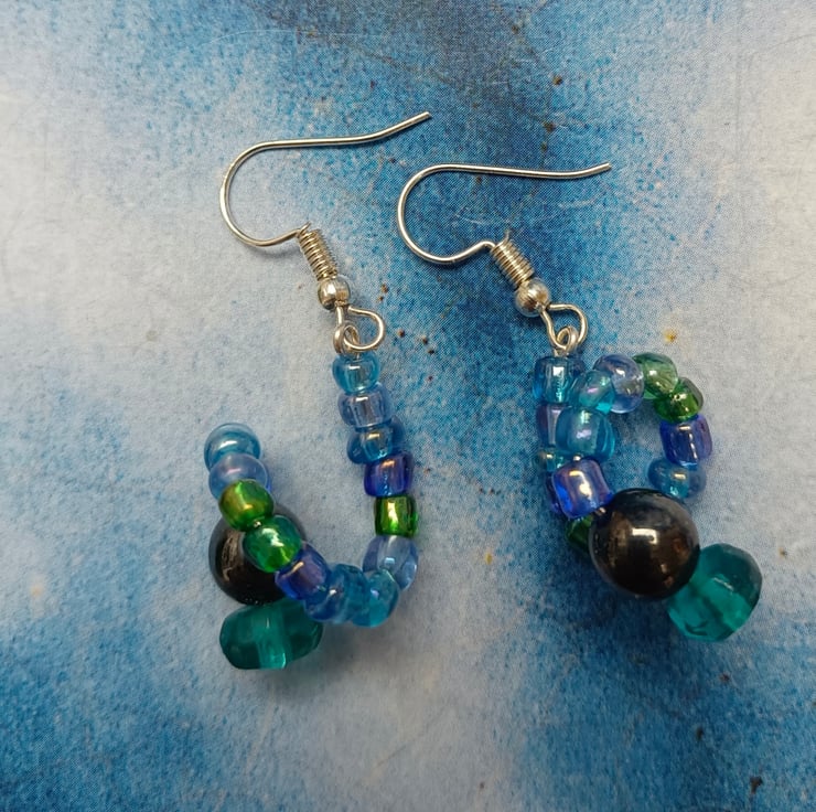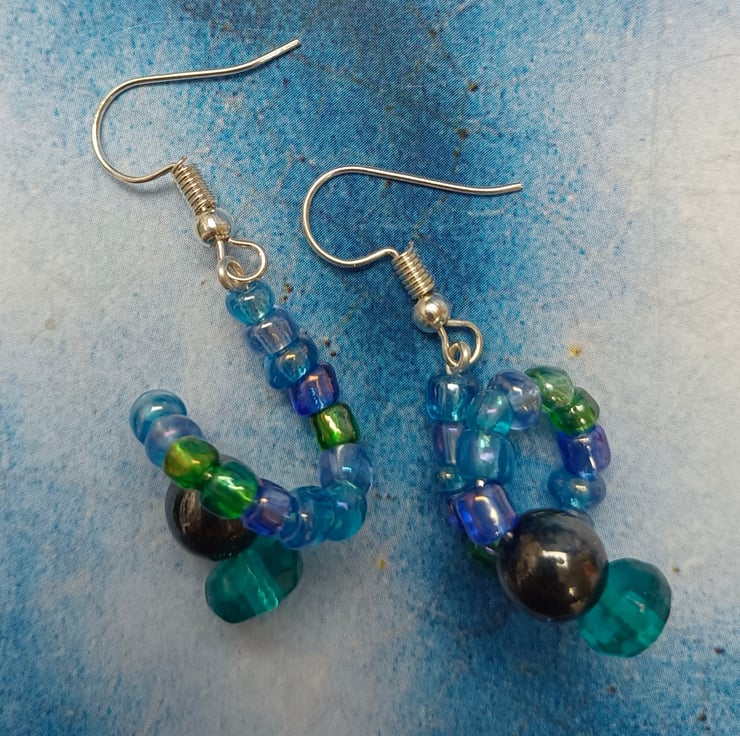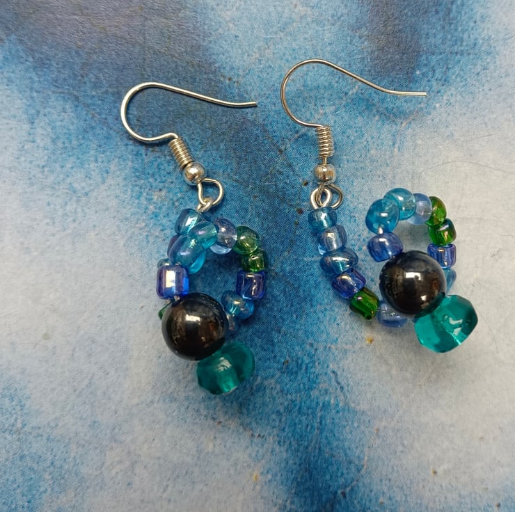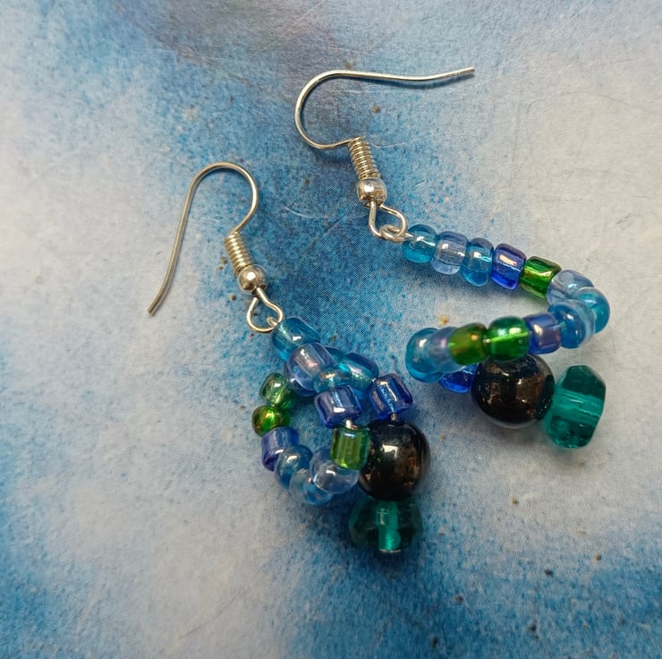 Very lovely handmade earrings with gorgeous glass beads taken from recycled costume jewellery. Lovely shades of blue & green twisting on a silver plated wire, hanging on sterling silver nickel free hooks.