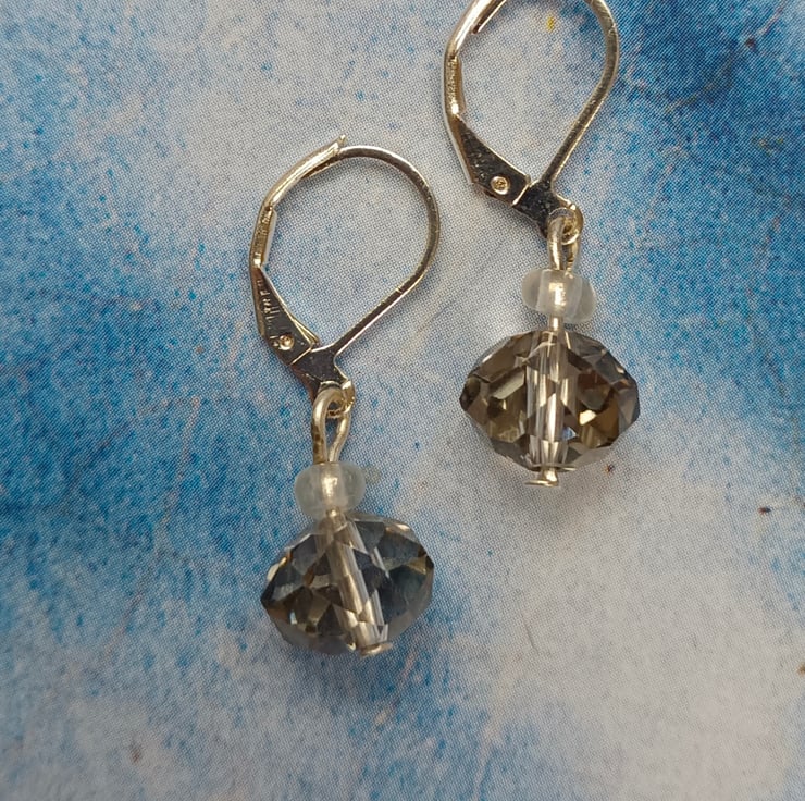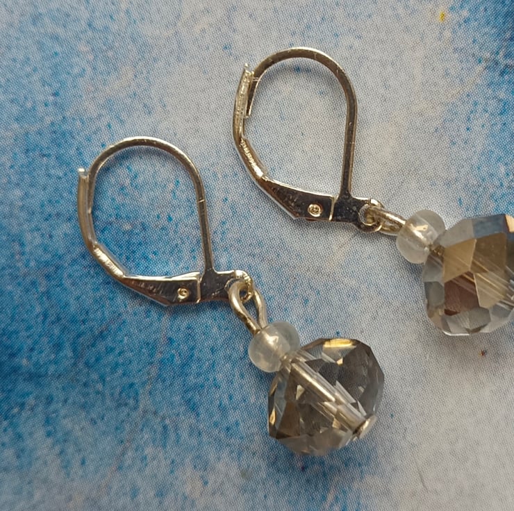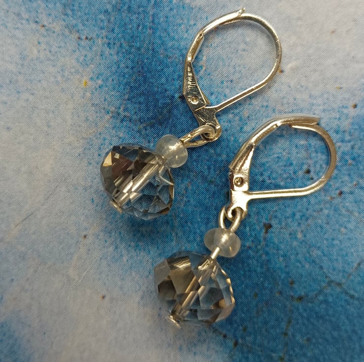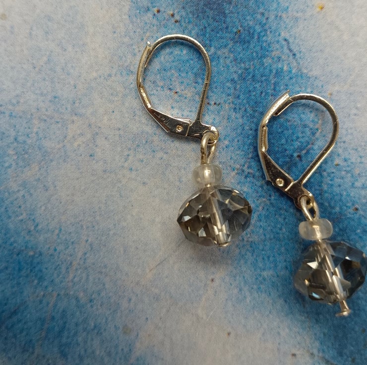 Such lovely handmade drop earrings made with recycled faceted glass beads which twinkle as they catch the light, hanging on silver plated lever back earring hooks.