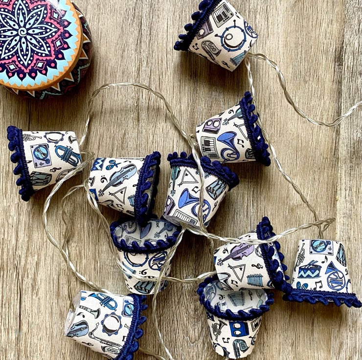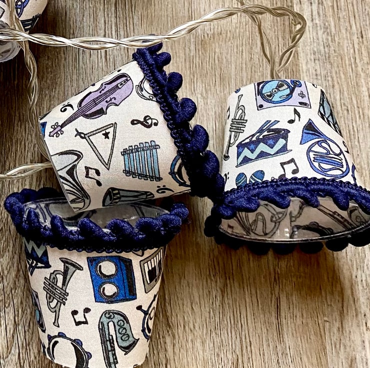 These lampshades are covered in Liberty of London Tana Lawn fabric in a gorgeous Miles design in shades of blue - perfect for the music lover