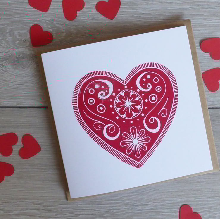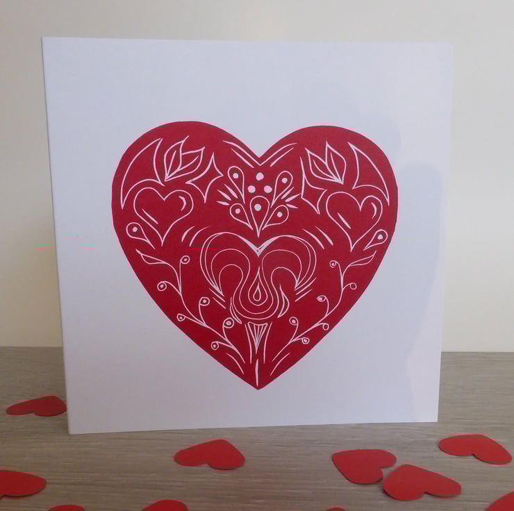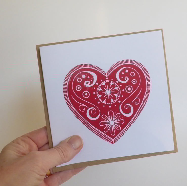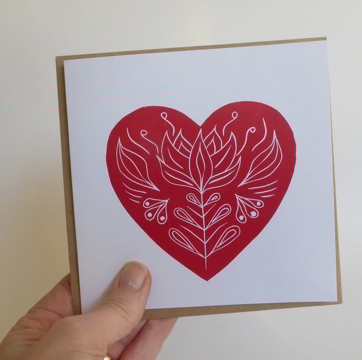 A handmade handprinted greeting card, with red linocut design printed on 300gsm card stock. The card is left blank inside for your own message, so it makes it an ideal Valentines or anniversary card.
