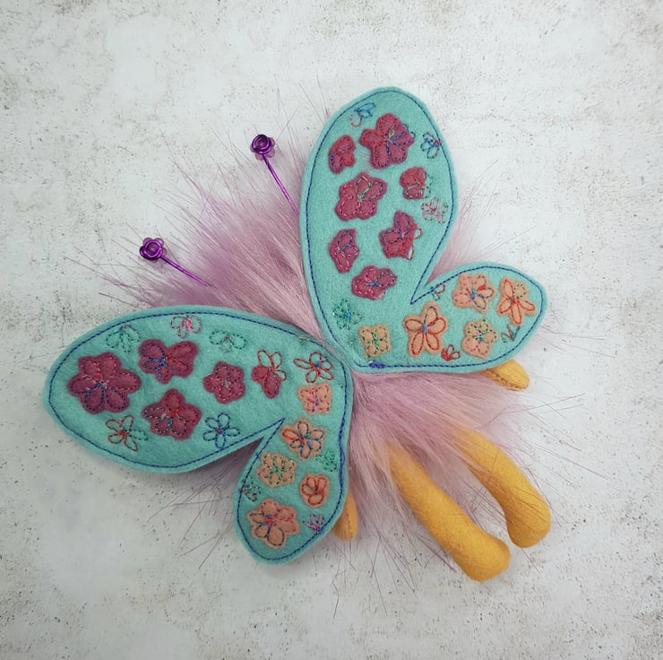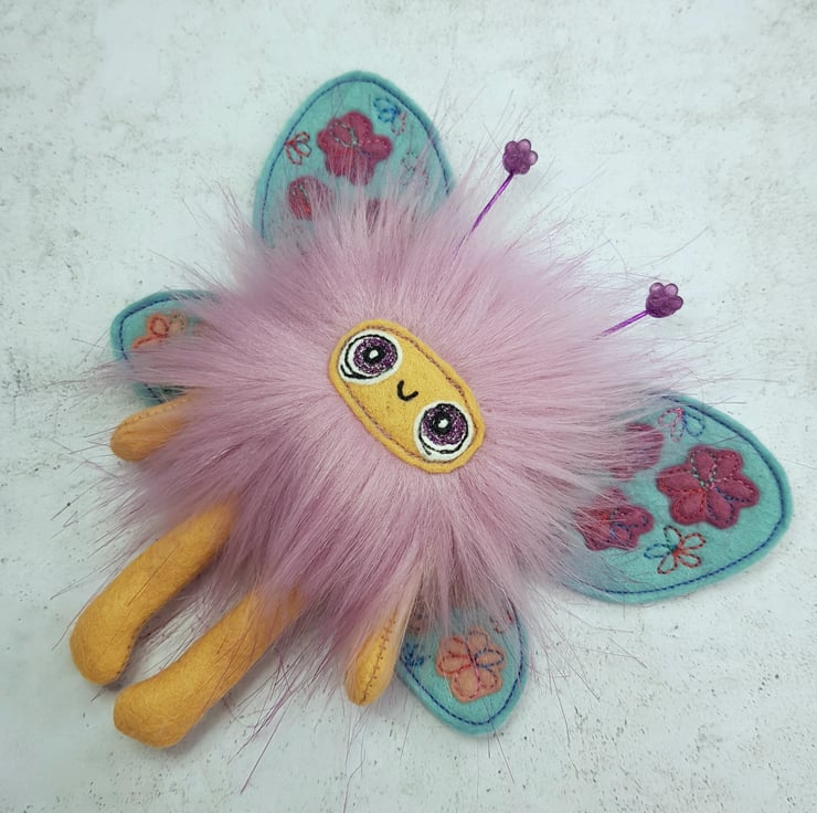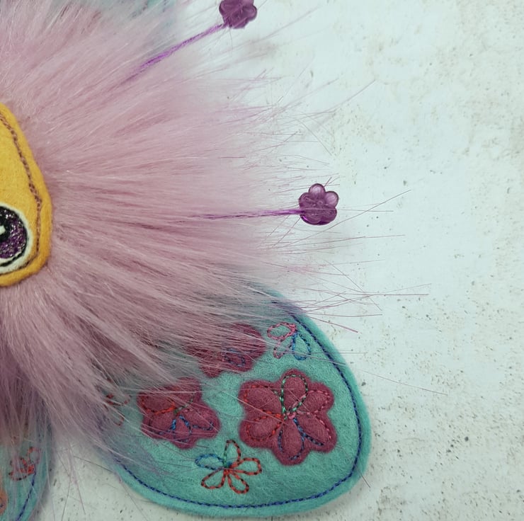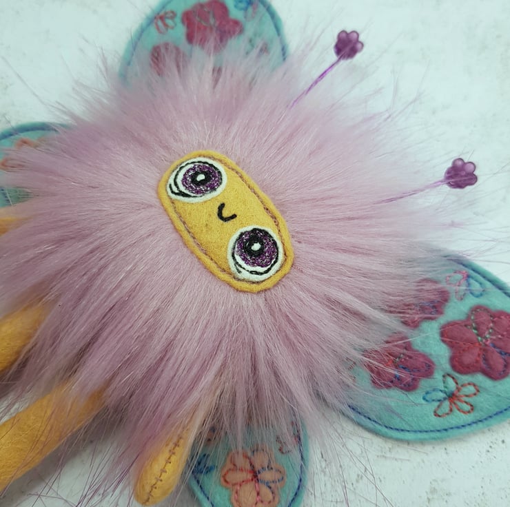 Spring imp made with the softest luxury faux fur. This imp has a free motion embroidered face with sparkly eyes. The face, arms and legs are all soft peach felt while the wings are a beautiful dusky blue with free motion embroidered flowers to the front and back. The antenna are made from wire with upcycled flower beads attached. Imp can be hung from the clear thread or can sit up with some encouragement. Imp measures roughly 13.5cm tall with a wingspan of 14cm. Sent in recyclable packaging.