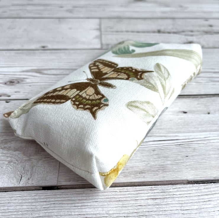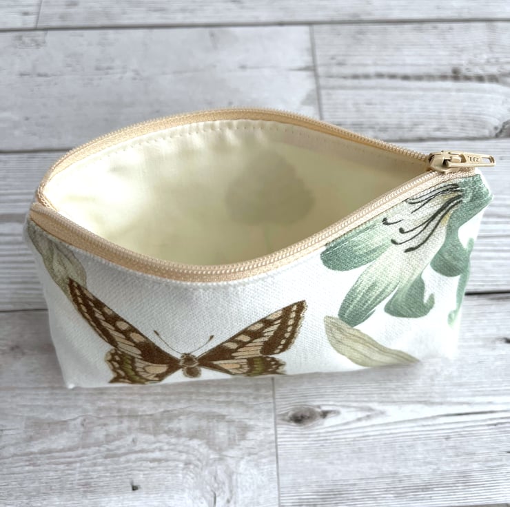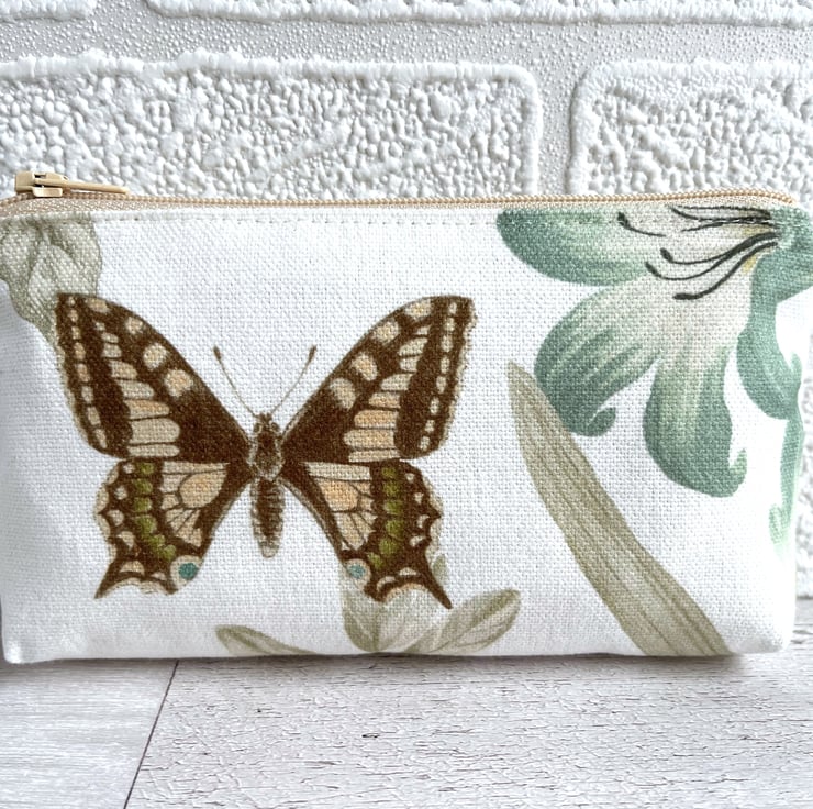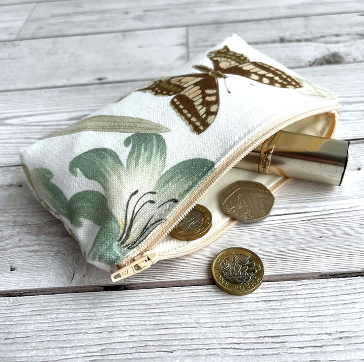Large coin purse with swallowtail butterfly. This large-sized purse is made from beautiful botanical print fabric featuring a pretty swallowtail butterfly and a lily on a white background. The butterfly is depicted in subtle shades of peach and brown, and is shown alongside a duck-egg blue lily with pale sage green foliage. The coin purse has a peachy cream zip and is lined with cream fabric. The base of the purse is boxed to give more space inside.