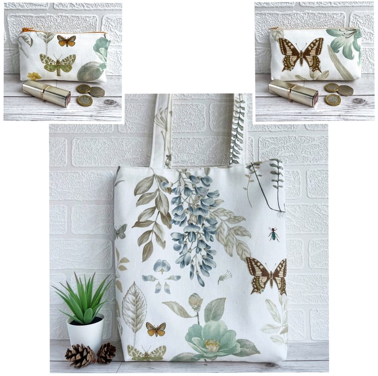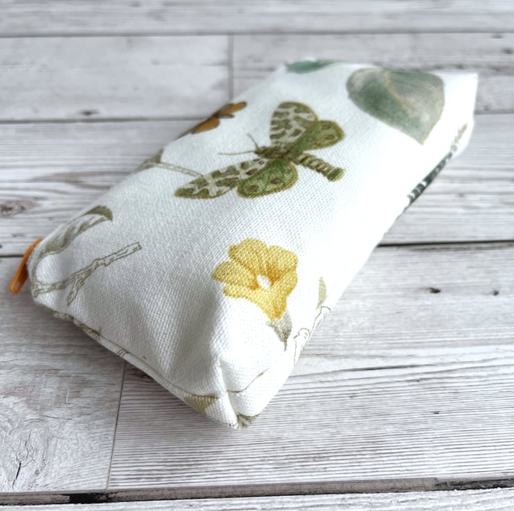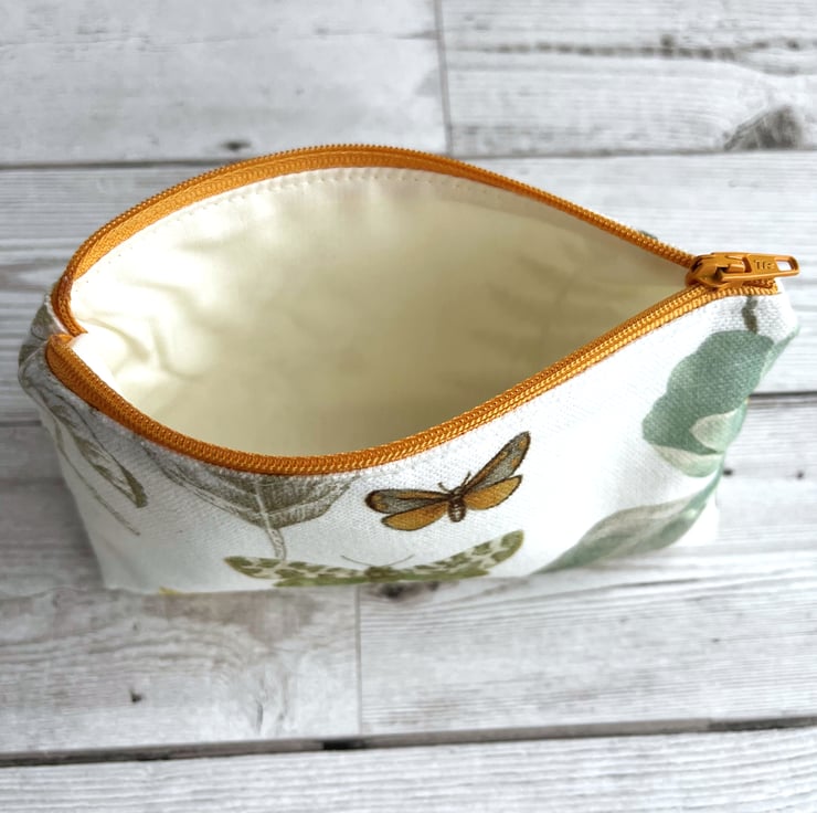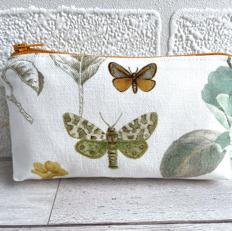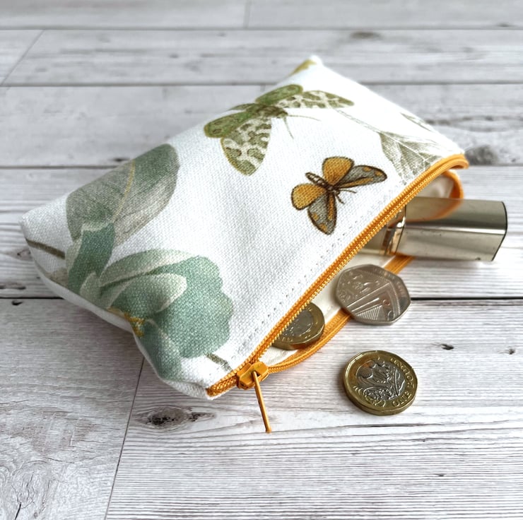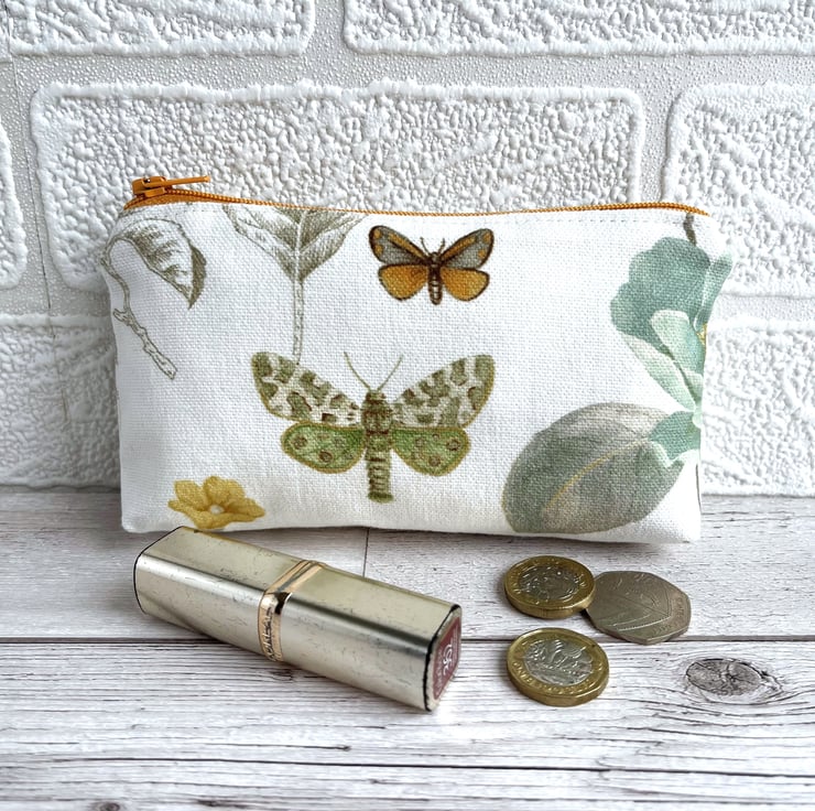 Large coin purse with butterfly and moth. This large-sized purse is made from fabric with a gorgeous botanical print pattern on a white background. The pattern features a burnt orange and beige butterfly and a green and cream moth. There are also glimpses of a duck egg blue flower, golden yellow flower and sage green leaves. The coin purse has a golden yellow zip and is lined with cream fabric. The base of the purse is boxed to give more space inside.