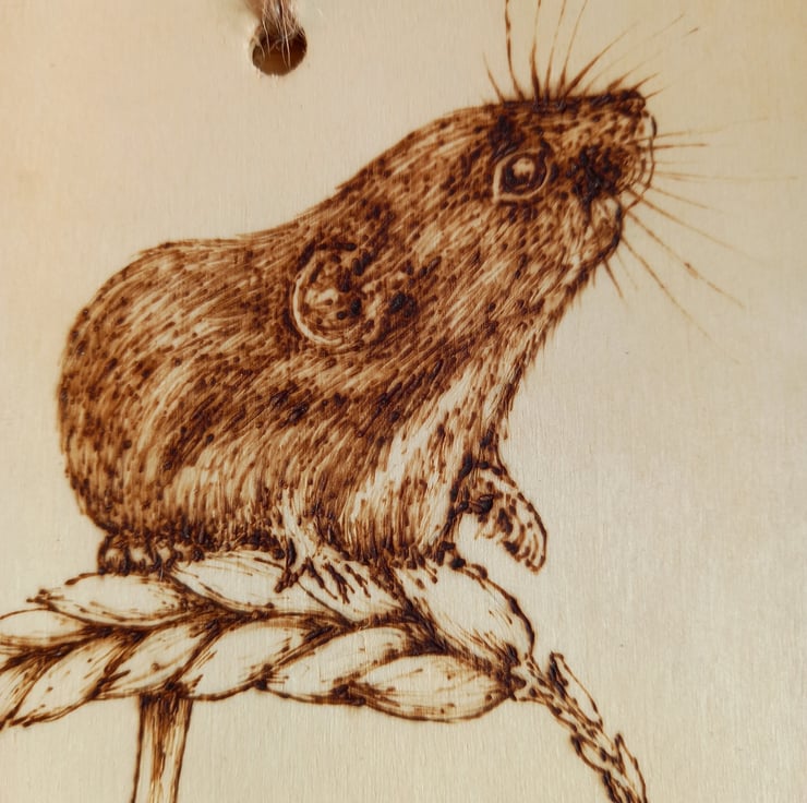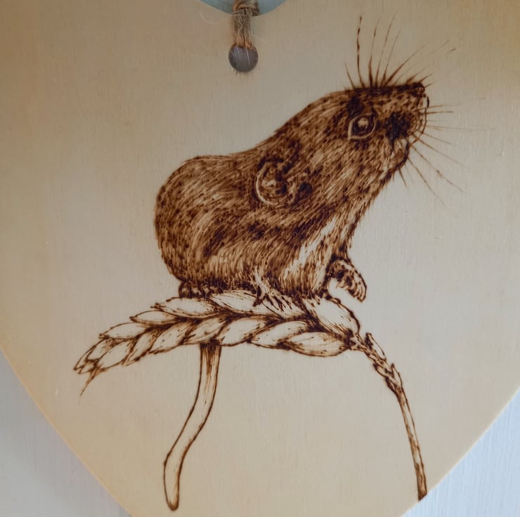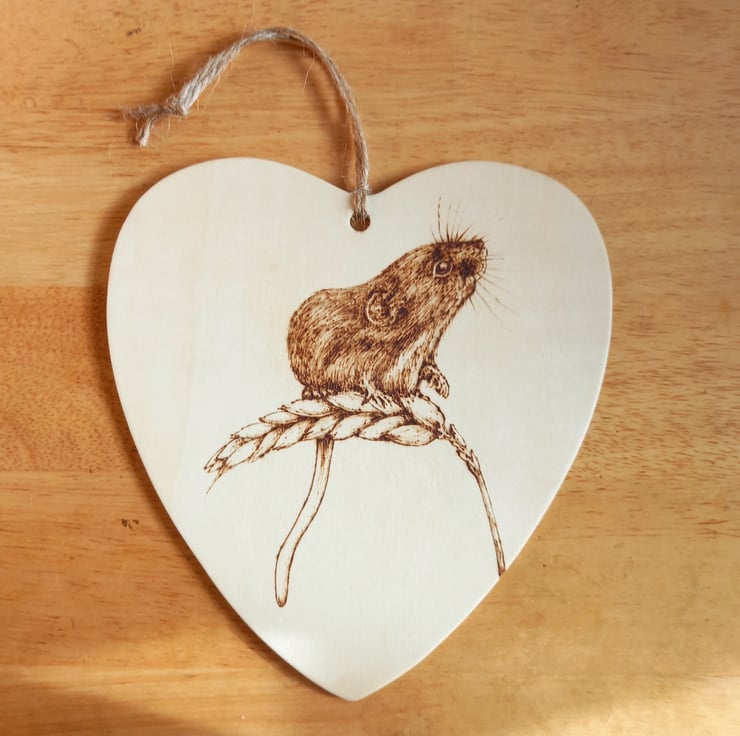 Wooden heart illustrated with a little harvest mouse on an ear of wheat using pyrography (wood burning).