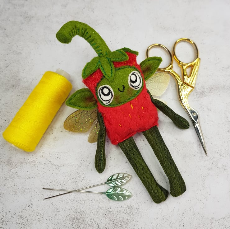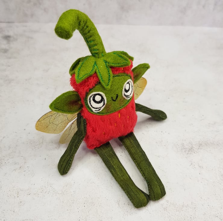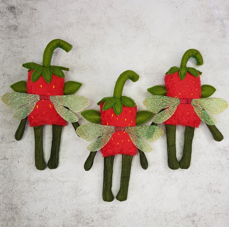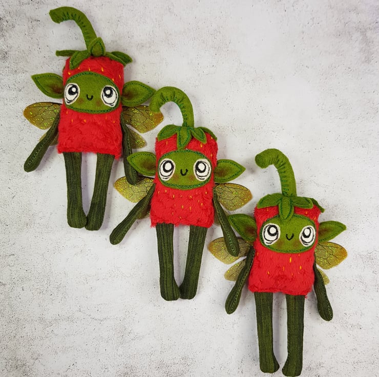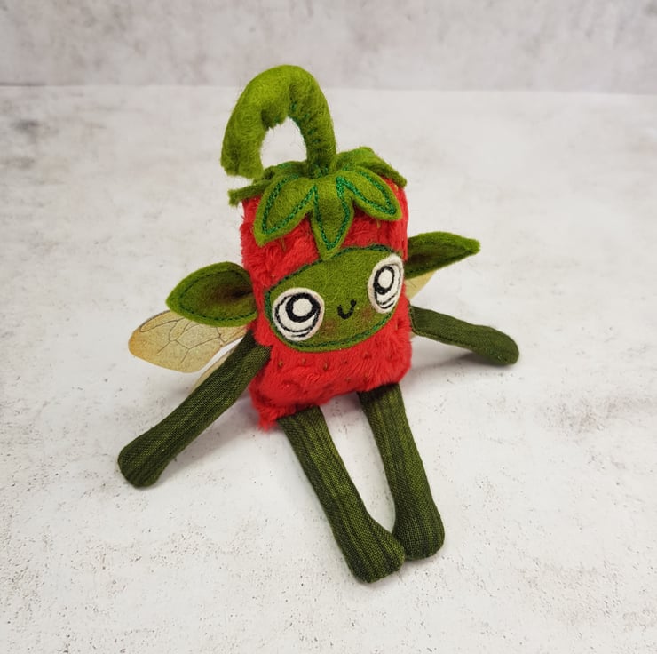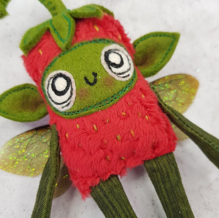Made with soft red plush, this cute fairy has a free motion embroidered felt face with hand stitched felt stem. Arms and legs are cotton and the yellow pips are hand embroidered all over the body. Fairy has printed sparkly glitter wings. Fairy measures roughly 12cm tall with an 8cm wingspan and comes with a clear thread hanger. This listing is for one fairy only.