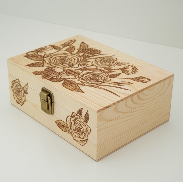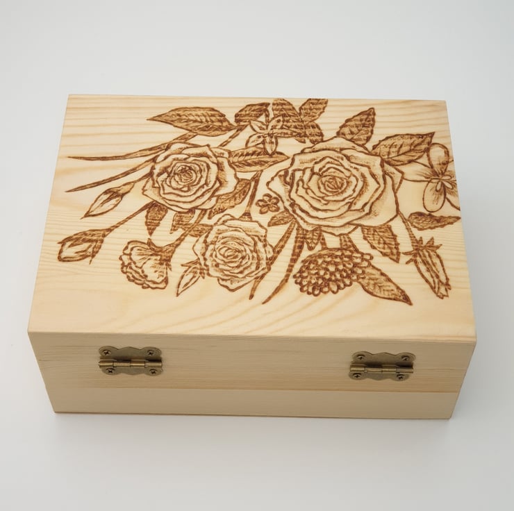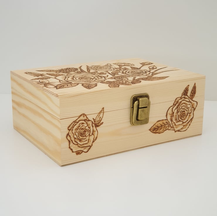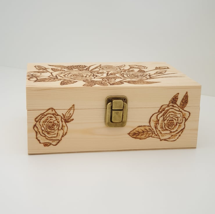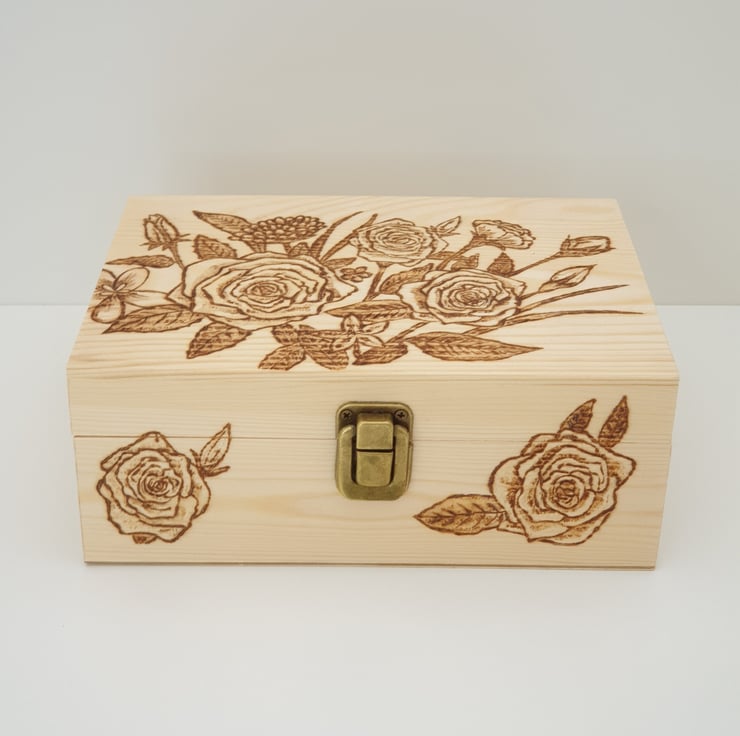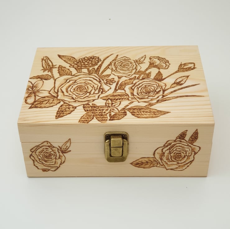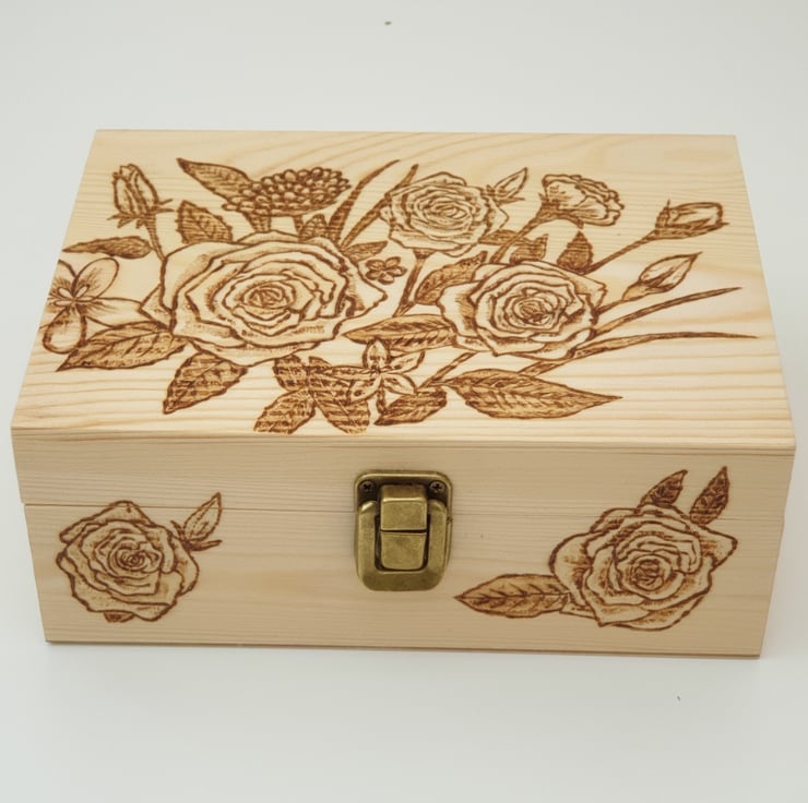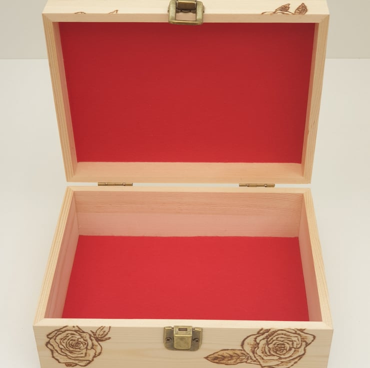 Beautiful rose design wooden pine box with a metal clasp. The pretty floral design has been handburnt on the lid and front of the box using the art of pyrography. The outside of the box has been treated with wood oil for a natural look. The inside of the box has been lined with red felt.