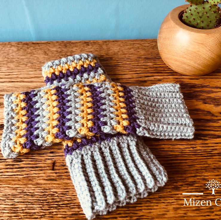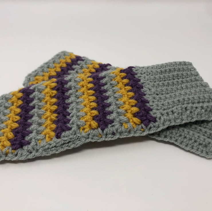 These are my longest pair of wrist warmers measuring approx 21cm in length using dk wool in grey, purple and gold. They have a thumb slit in the side and fit snugly inside your sleeves giving you that extra little bit of warmth whilst still being able to use your fingers. I use mine while I'm driving and teaching in my cold classroom! Perfect gift for any teacher I can tell you!