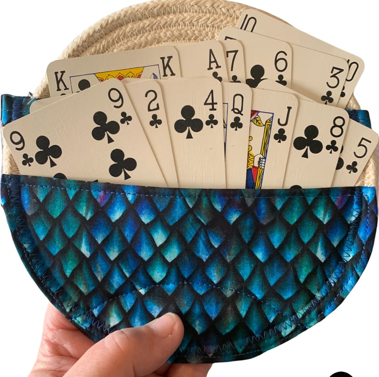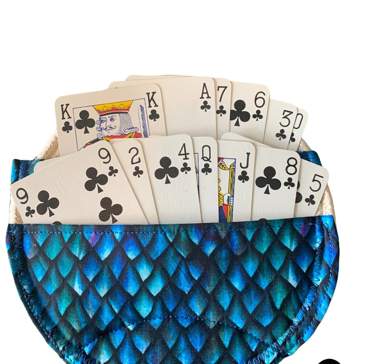 A card holder for up to 13 playing cards, ideal for Bridge, Canasta or UNO. Approximately 6 1/2” (16cms) and 100% cotton.