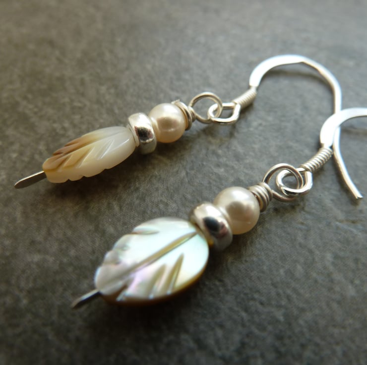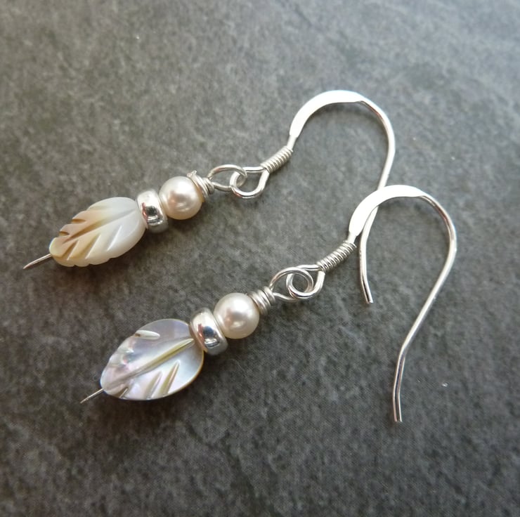 A pair of earrings made with sterling silver ear wires, glass pearls, sterling silver beads and shell leaf shaped beads.