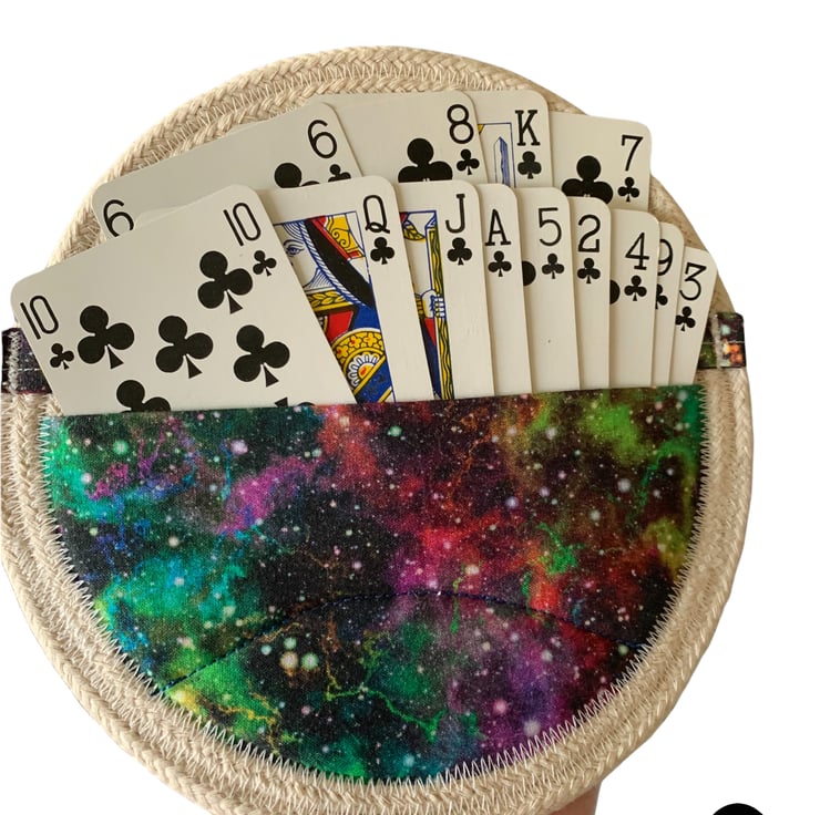 A card holder for up to 15 playing cards, ideal for Bridge, Canasta or UNO. Approximately 6 1/2” (16cms) and 100% cotton.