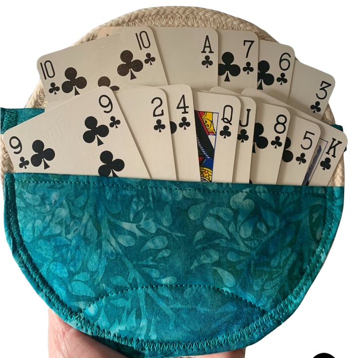 A card holder for up to 13 playing cards, ideal for Bridge, Canasta or UNO. Approximately 6 1/2” (16cms) and 100% cotton.