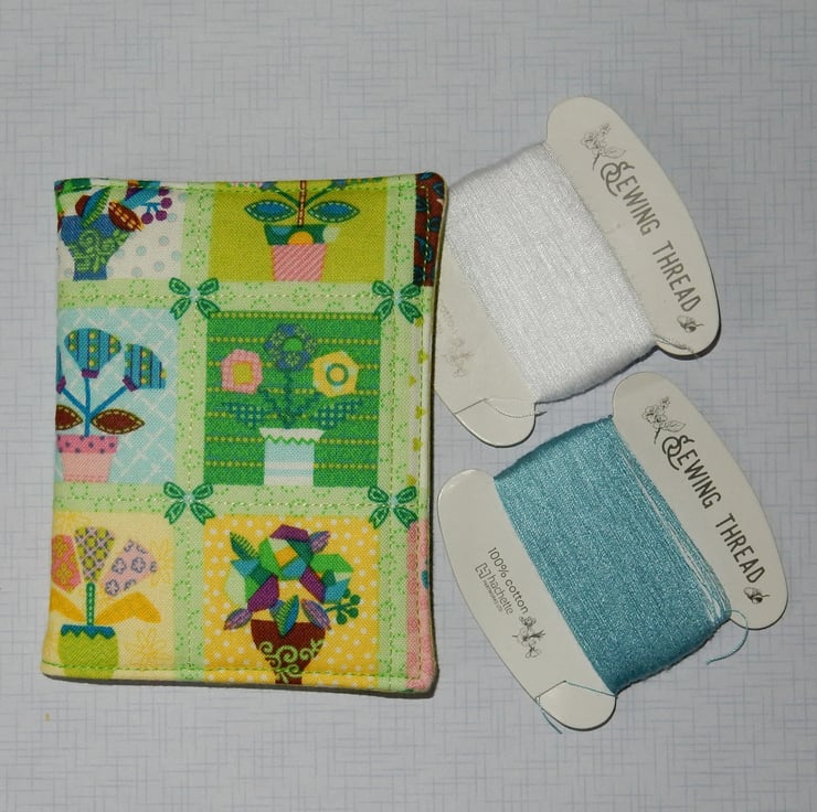 This needle case has a layer of padding for luxury and protection from escaping needles. It is made from a delightful fabric featuring bright funky flowers and leaves in pots. It has a toning floral print for the lining. The needle case measures approx. 4.5 x 3.25 inches, and has four felt leaves for your pins and needles.