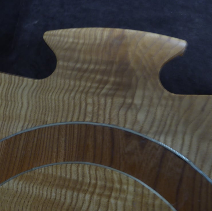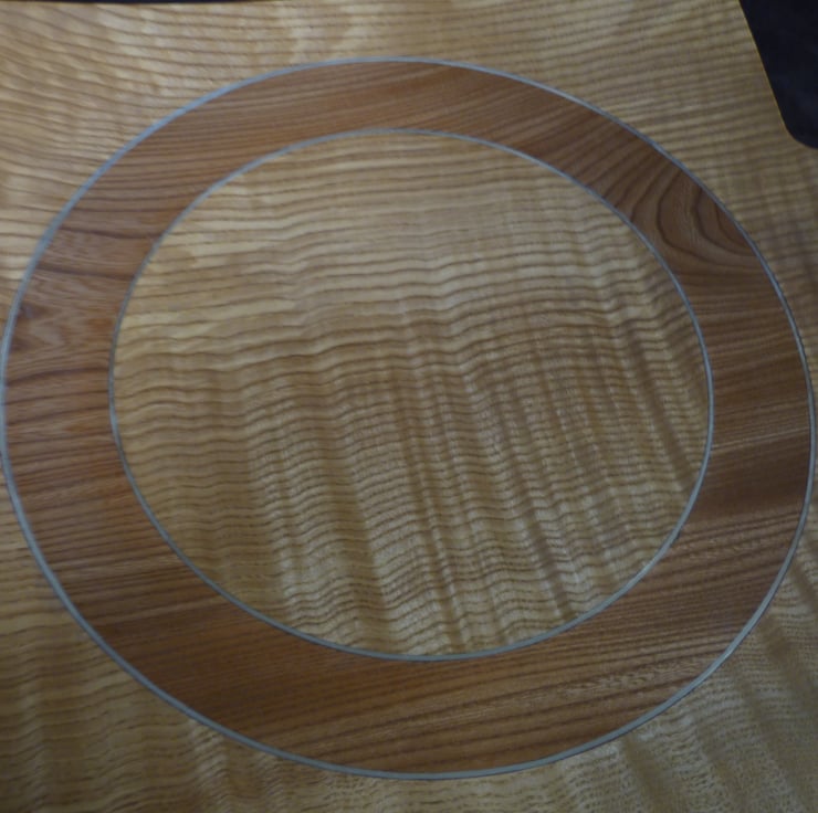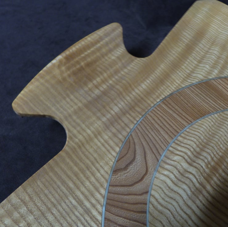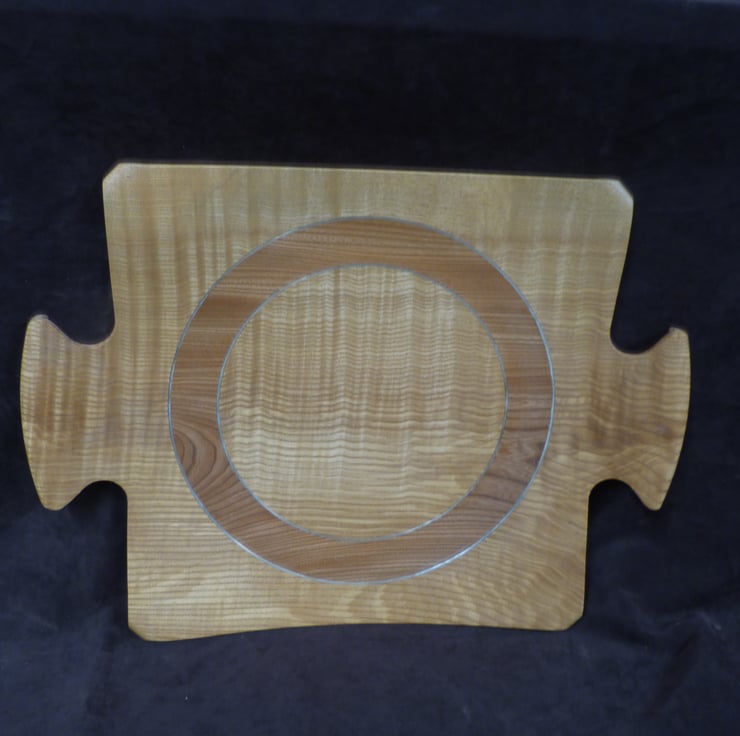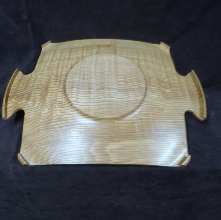 A decorative platter in heavily grained Ash 19 inches long 14 inches wide. This piece was lathe turned thickness is now 6mm. It was then cut rectangular to allow the integral handles. Elm was introduced to the centre with two strips of sterling silver.