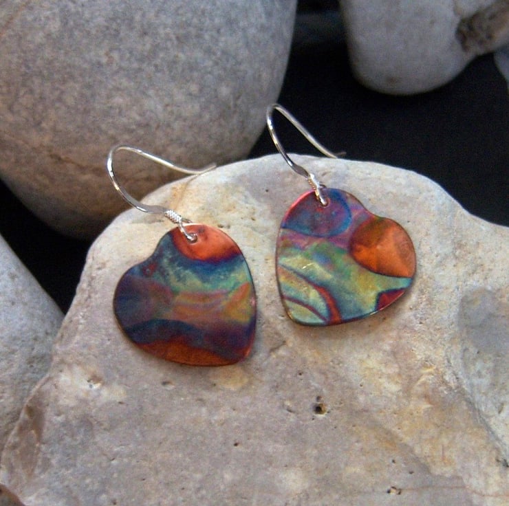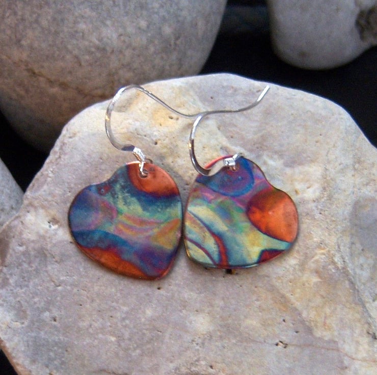 These copper heart shaped earrings are approximately 2cms across. Sterling silver ear wires. They have been flame painted. This is a technique that produces a one-of-a-kind effect as you can see, the pattern will not be replicated. It is done with a micro torch, producing different hues of blue, green, pink, purple, gold with each firing.