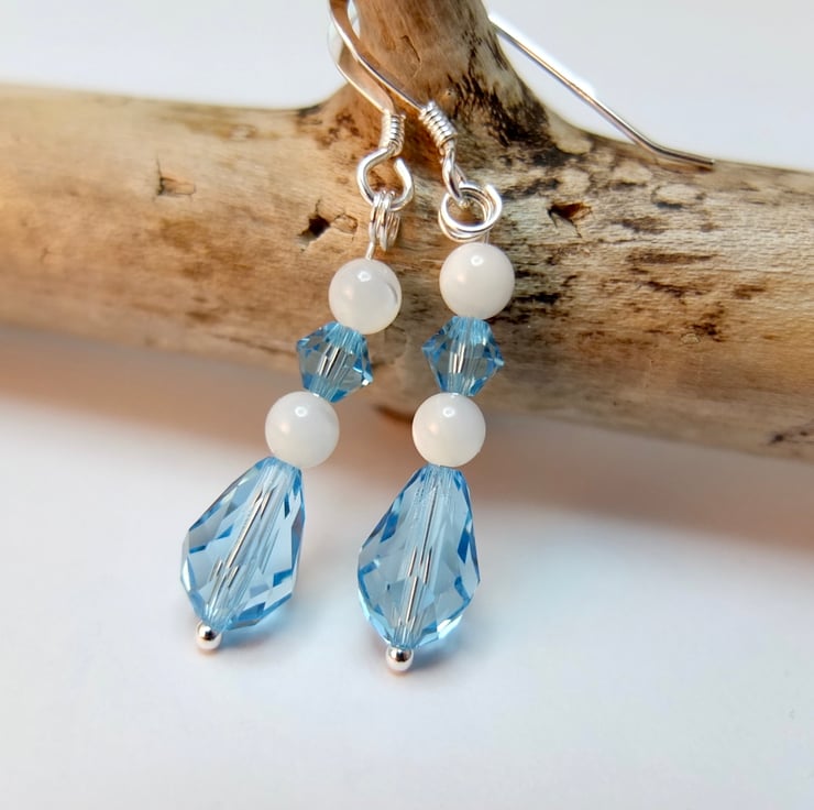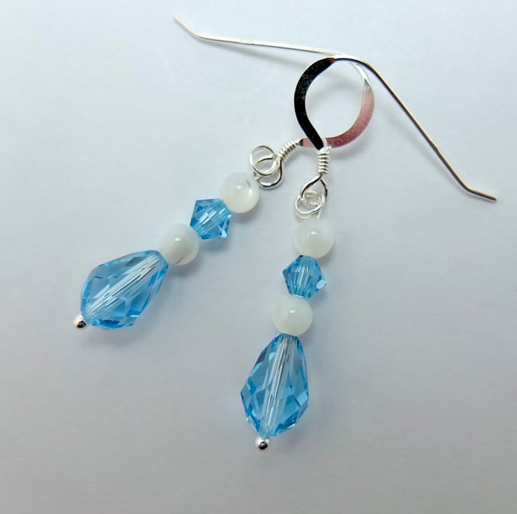 Beautifully sparkly sterling silver earrings that feature a 9mm x6mm Swarovski crystal teardrop in a colour called "aquamarine", topped with two 4mm white mother-of-pearl beads separated by a Swarovski 4mm "aquamarine" bicone.
