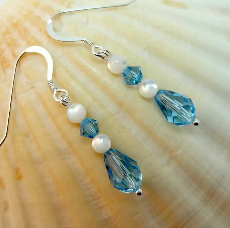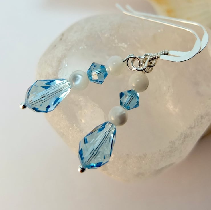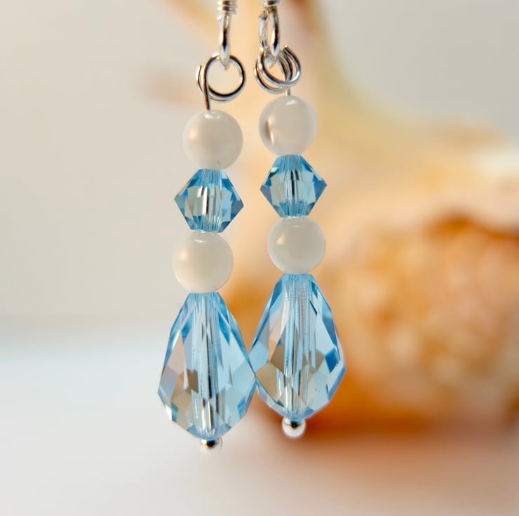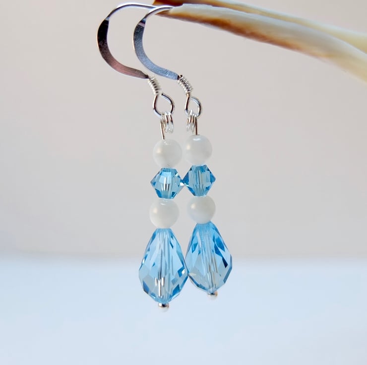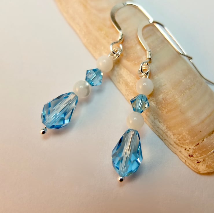 Beautifully sparkly sterling silver earrings that feature a 9mm x6mm Swarovski crystal teardrop in a colour called "aquamarine", topped with two 4mm white mother-of-pearl beads separated by a Swarovski 4mm "aquamarine" bicone.