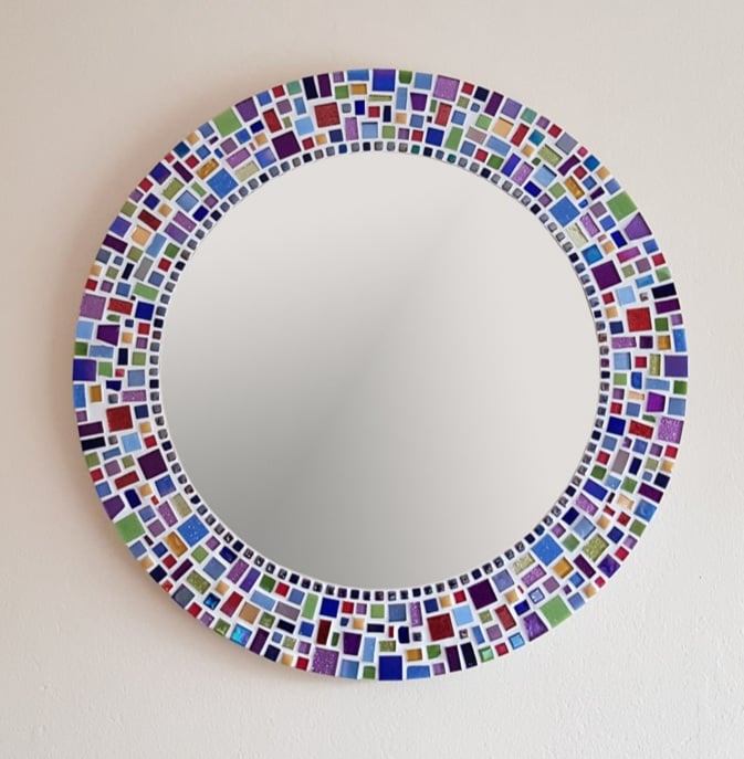 The mosaic frame features hand-cut glass mosaic tiles in bold tones of blue, purple, green, red and gold.