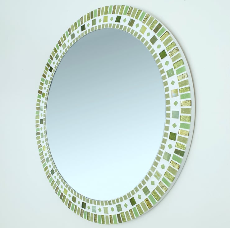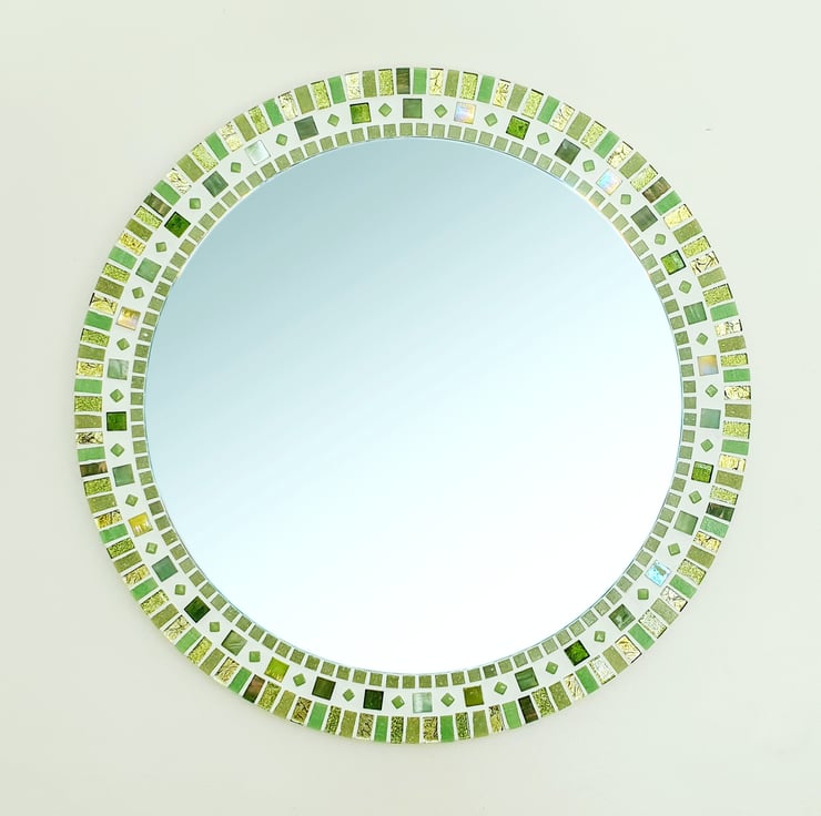 If you're looking for a unique wall mirror that stands out from the crowd, then look no further. This striking round mosaic mirror is created with hand cut glass mosaic tiles in varying shades of lime / yellowy green. The combination of matt, foil-backed and glitter tiles adds a beautiful subtle sparkle.