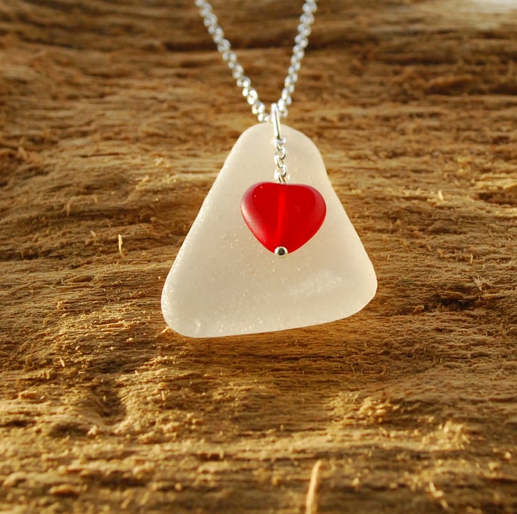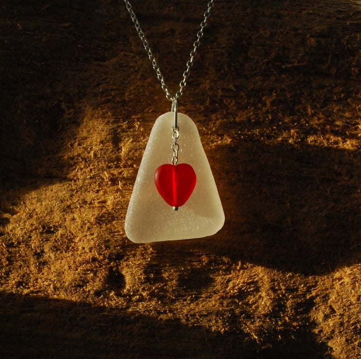 We rarely find such beautifully frosted white sea glass of this size and shape. The sea glass has probably come from an old bottle because it is gently curved. We've used the curve to cradle the shiny glass heart as can be seen in photo 3. All the metal used in this pendant is sterling silver.