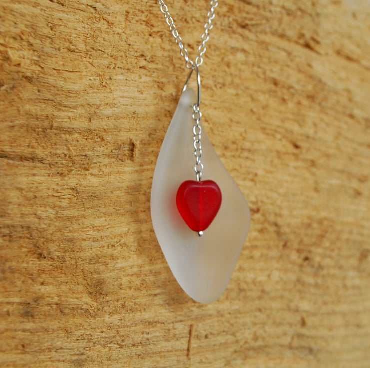This is an exceptional piece of tumbled beach glass, which is beautifully shaped and curved. We've used the curve of the glass behind a shiny red glass heart, hung on sterling silver, to create a stunning pendant.