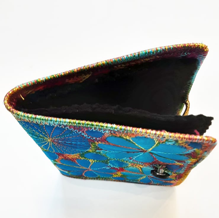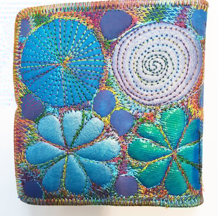 Made from layers of fabric including hand dyed Egyptian cotton and silk fabrics using the free machine embroidery style of sewing