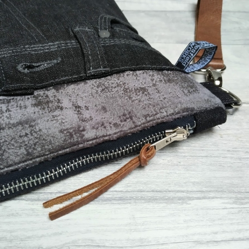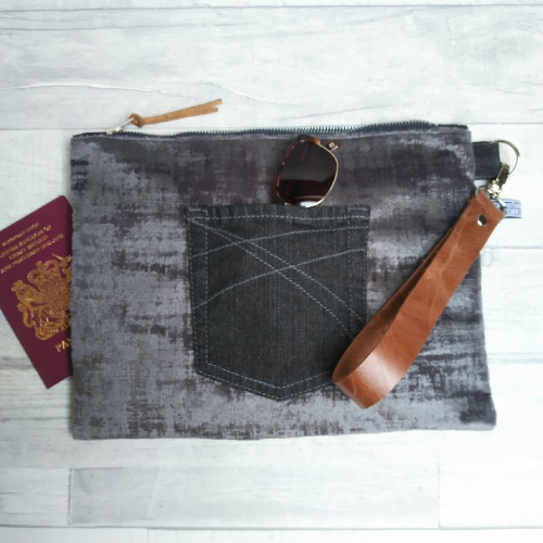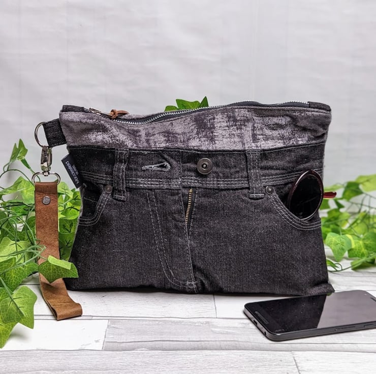 The front of the bag has a pre-loved black denim panel with features from the original jeans including functional pockets. The back of the bag is made from chenille and has a patch pocket from the original jeans. A good quality, recycled metal zip with leather zip pull keeps the bag secure, a detachable leather wrist strap adds to the secure and quality feel of the bag. Inside there's a divided slip pocket to keep your phone within easy reach and other small items tidy.
