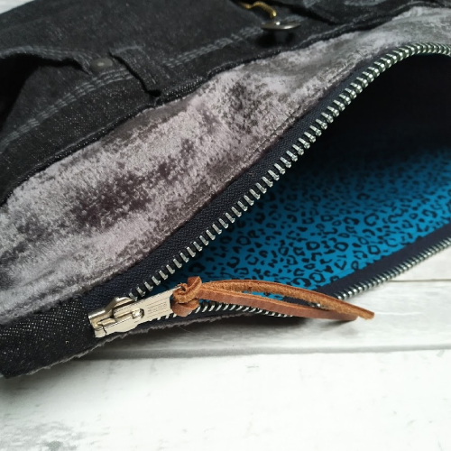 Truly unique with an edgy vibe, this clutch bag is made from upcycled, pre-loved denim with a dark grey, stroke-able chenille upholstery textile. It's lined with an on-trend, teal and black leopard print cotton lining.