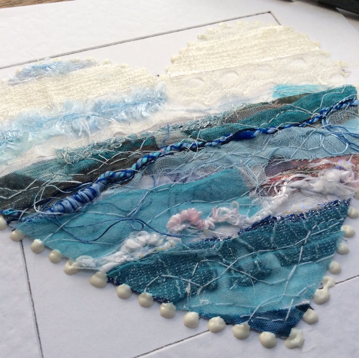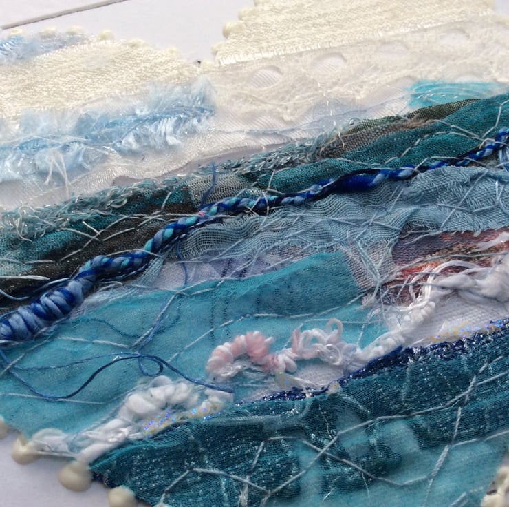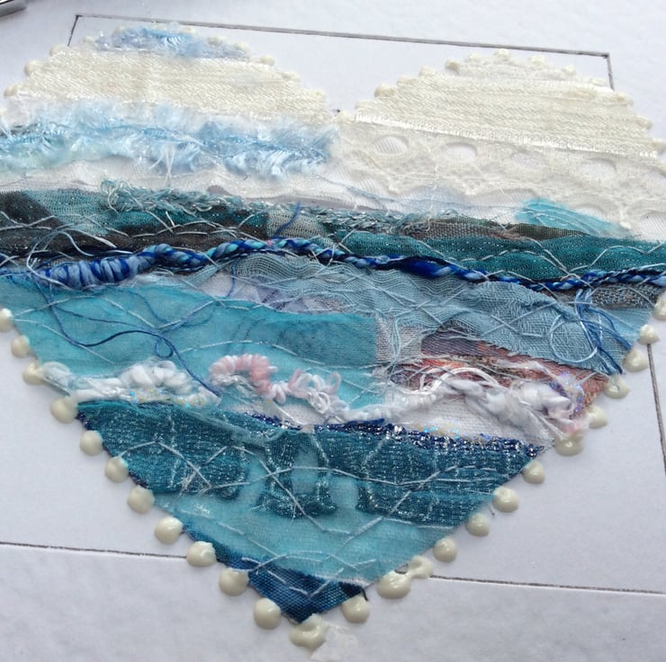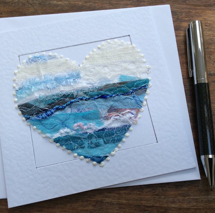 This embroidered heart has been made with my own handmade up-cycled fabric. This beautiful seascape heart has been made from silk, threads, cottons, lace, wool and enhanced with free motion embroidery. It’s framed with glitter and 3-D dots. It’s perfect for a wedding, anniversary, engagement, Valentines or for someone very special. It is blank inside making it ideal for any occasion. This Hammer White Card measures 14.5 x 14.5cm, comes with an envelop and in a plastic cover for protection.