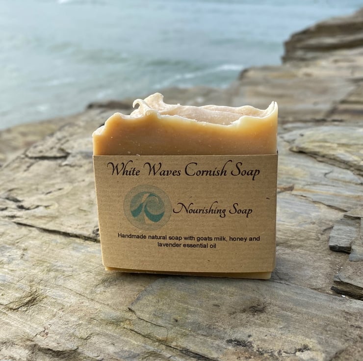 A luxurious natural soap bar handmade from a skin friendly selection of high quality plant oils and plant butters, with Goats Milk and Cornish honey, and a hint of pure, organic lavender essential oil.