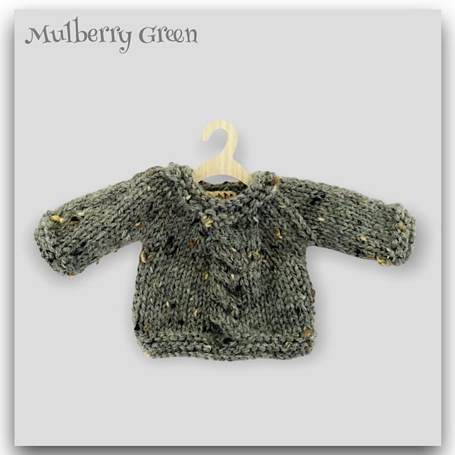A lovely grey tweed jumper with a cable down the front, to fit the Mulberry Green characters. The jumper is hand knitted from tweed wool.