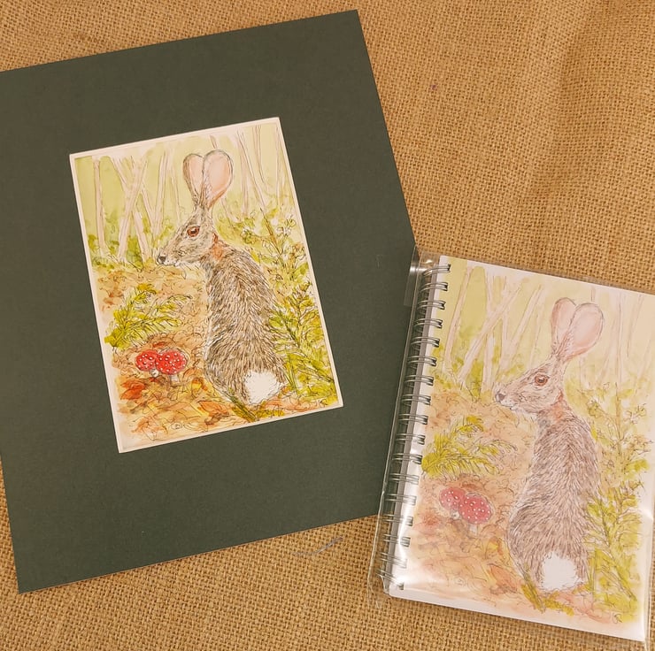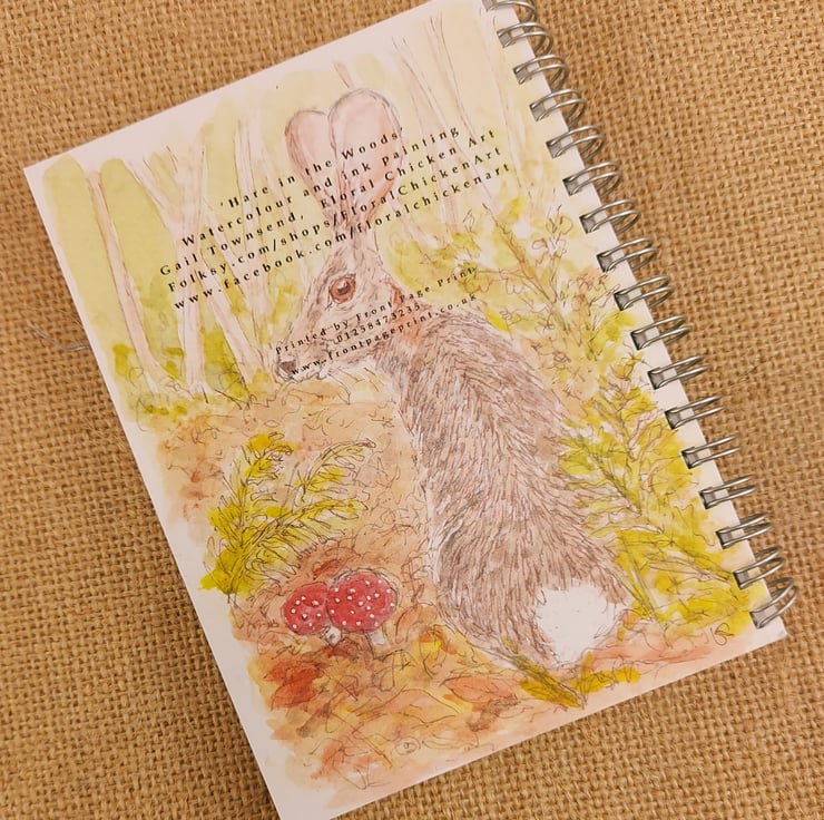 A6 spiral bound notebook printed with my watercolour illustration of a hare in an imagined woodland.