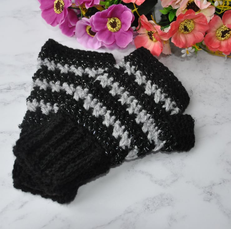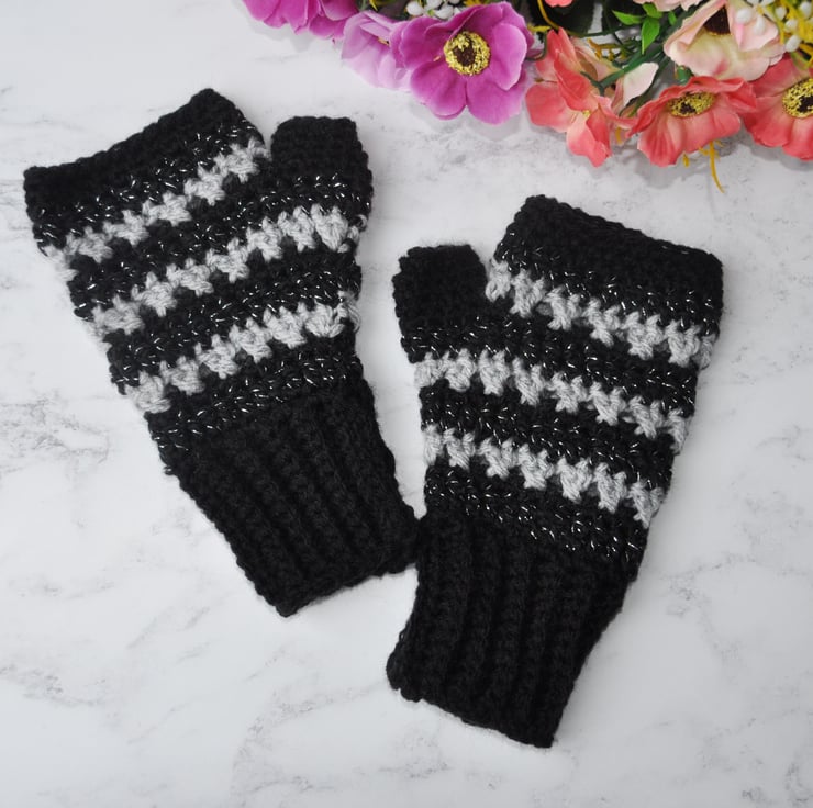 I have hand crocheted these gorgeous finger less gloves to fit girls and ladies in high-end luxury yarns with a palette of black, grey and silver sparkle, using my very pretty pattern. The cuffs are a really good length to keep your wrists warm too.