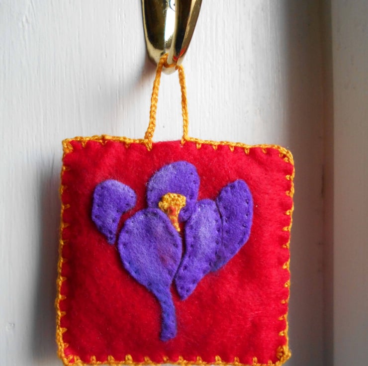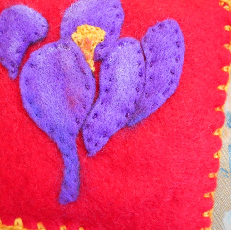 This miniature textile wall art with a purple crocus flower is a mixed media piece. I added touches of white and red pastels on the petals.