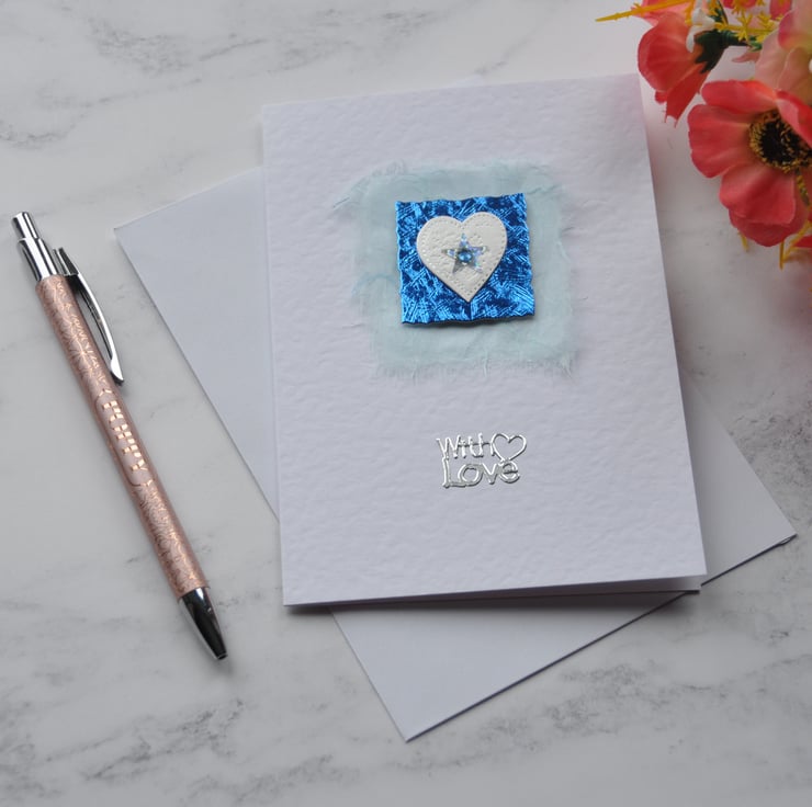 This design is a 3D love heart mounted onto a mixed media base with my blue handmade paper and a star with blue gem in the centre.