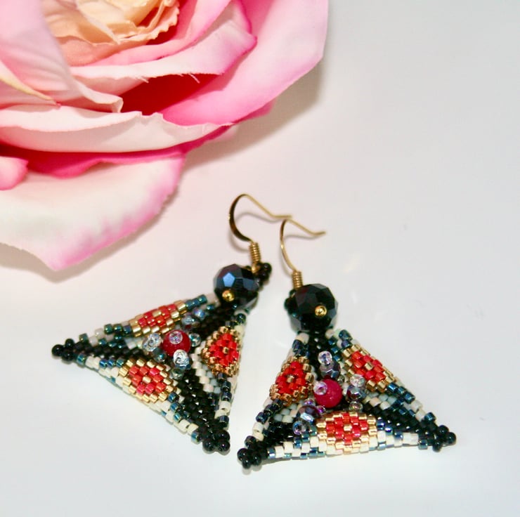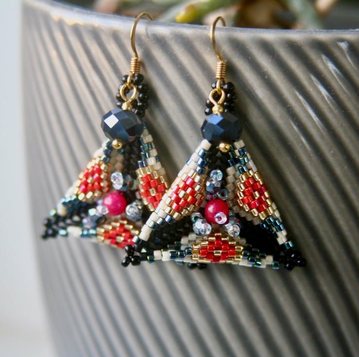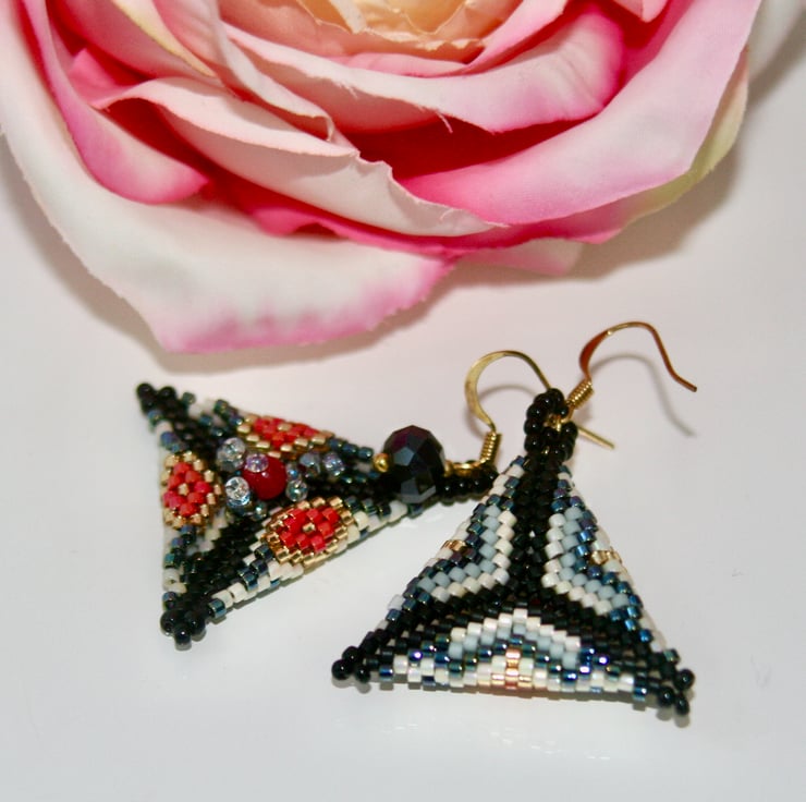 Striking triangle shaped earrings made with Miyuki delica seed beads stitched using an intricate Peyote pattern by June Malone. They are embellished on the front with red, clear and black glass beads.